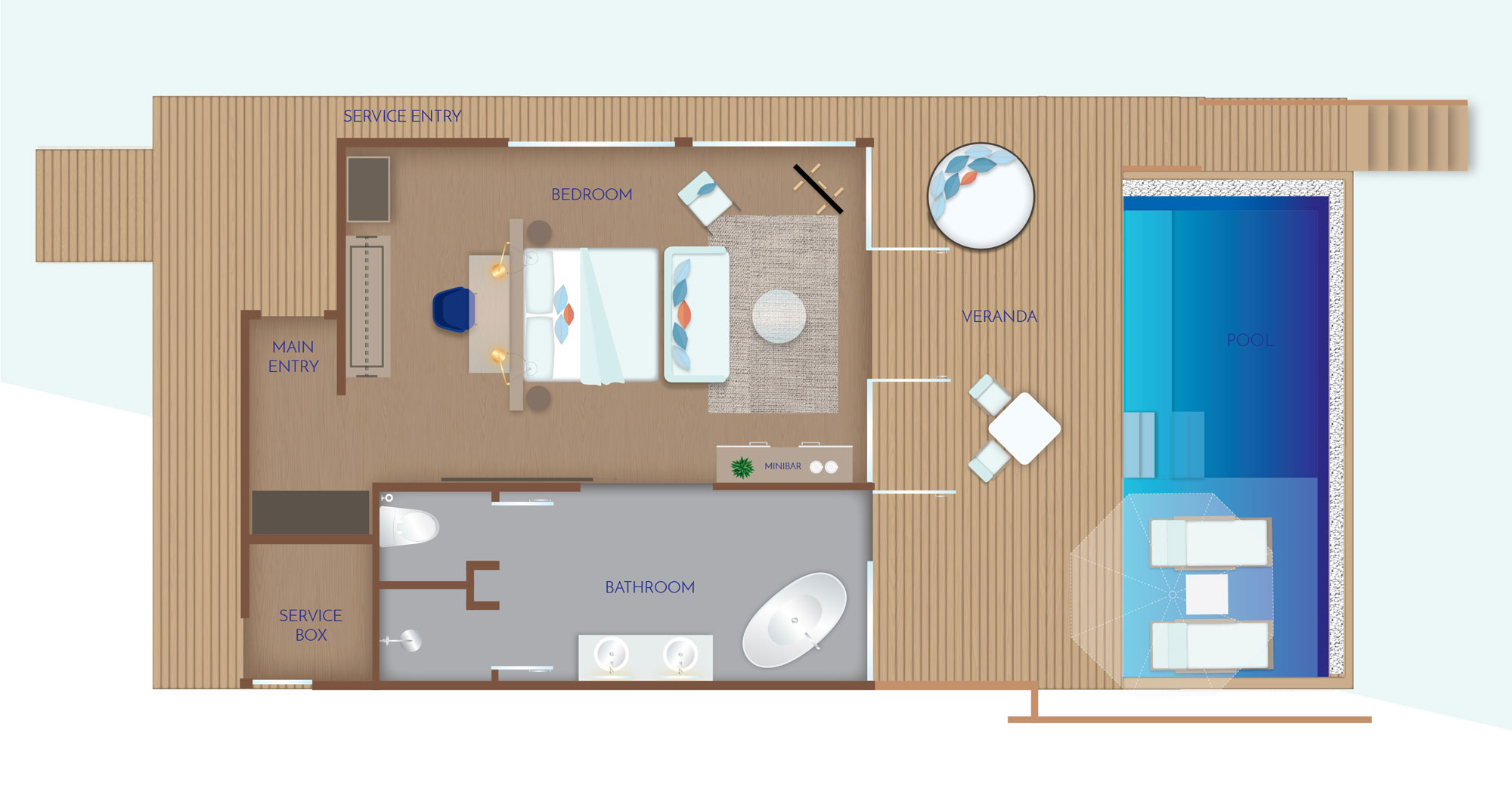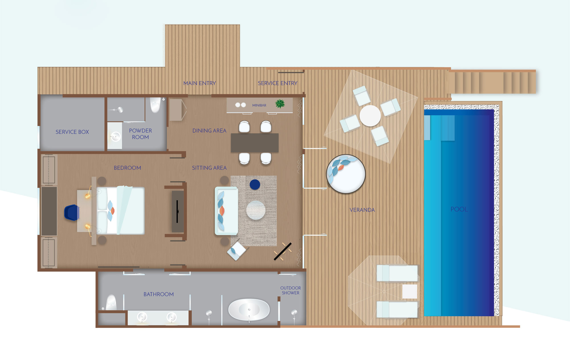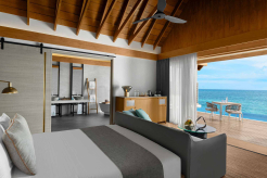Вилла на воде. Спальня с кроватью king-size, гостиная с обеденной зоной, 2 ванные комнаты (одна – с ванной и душевой кабиной, другая – с душевой кабиной), душ на открытом воздухе, терраса с бассейном, прямой спуск к воде.