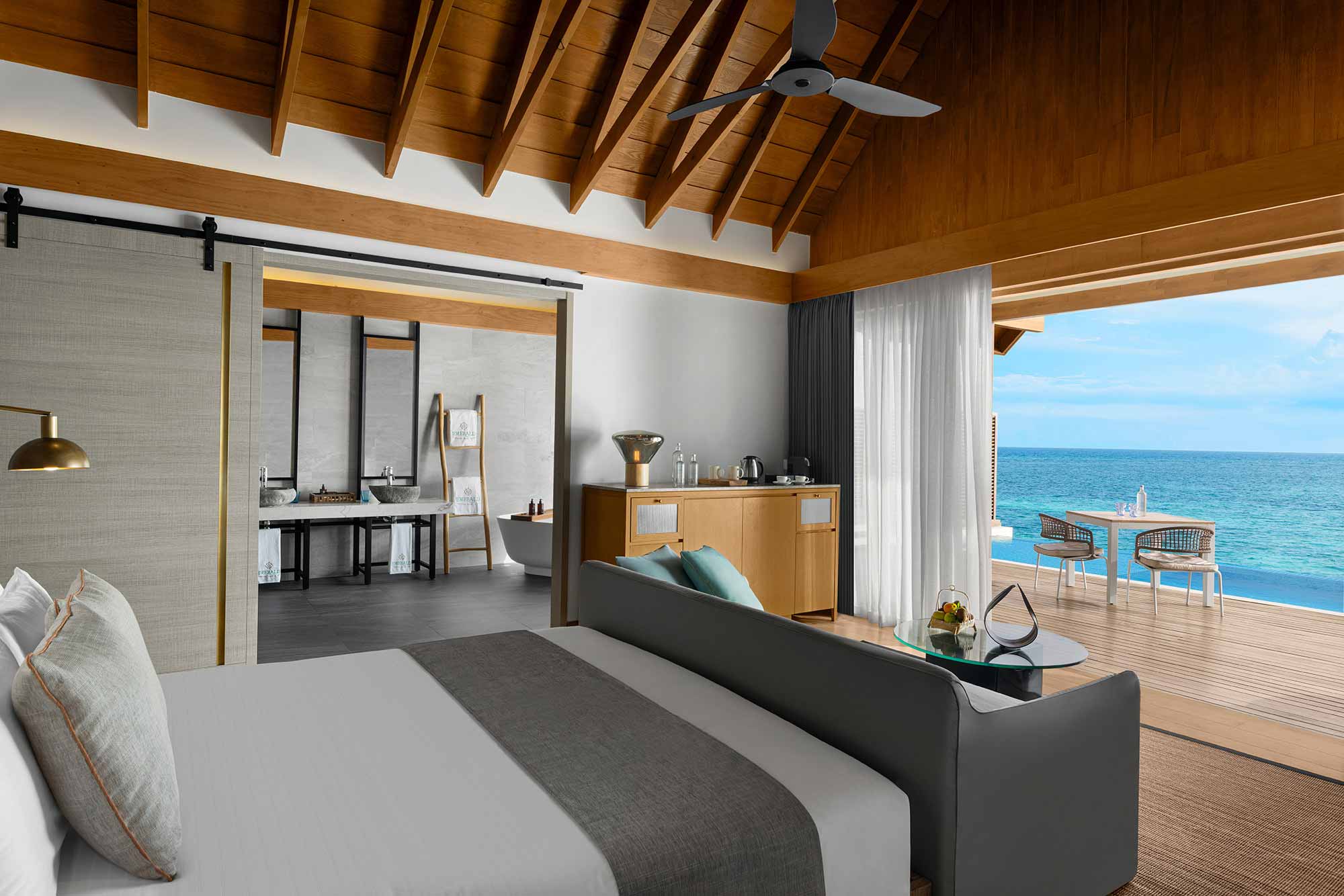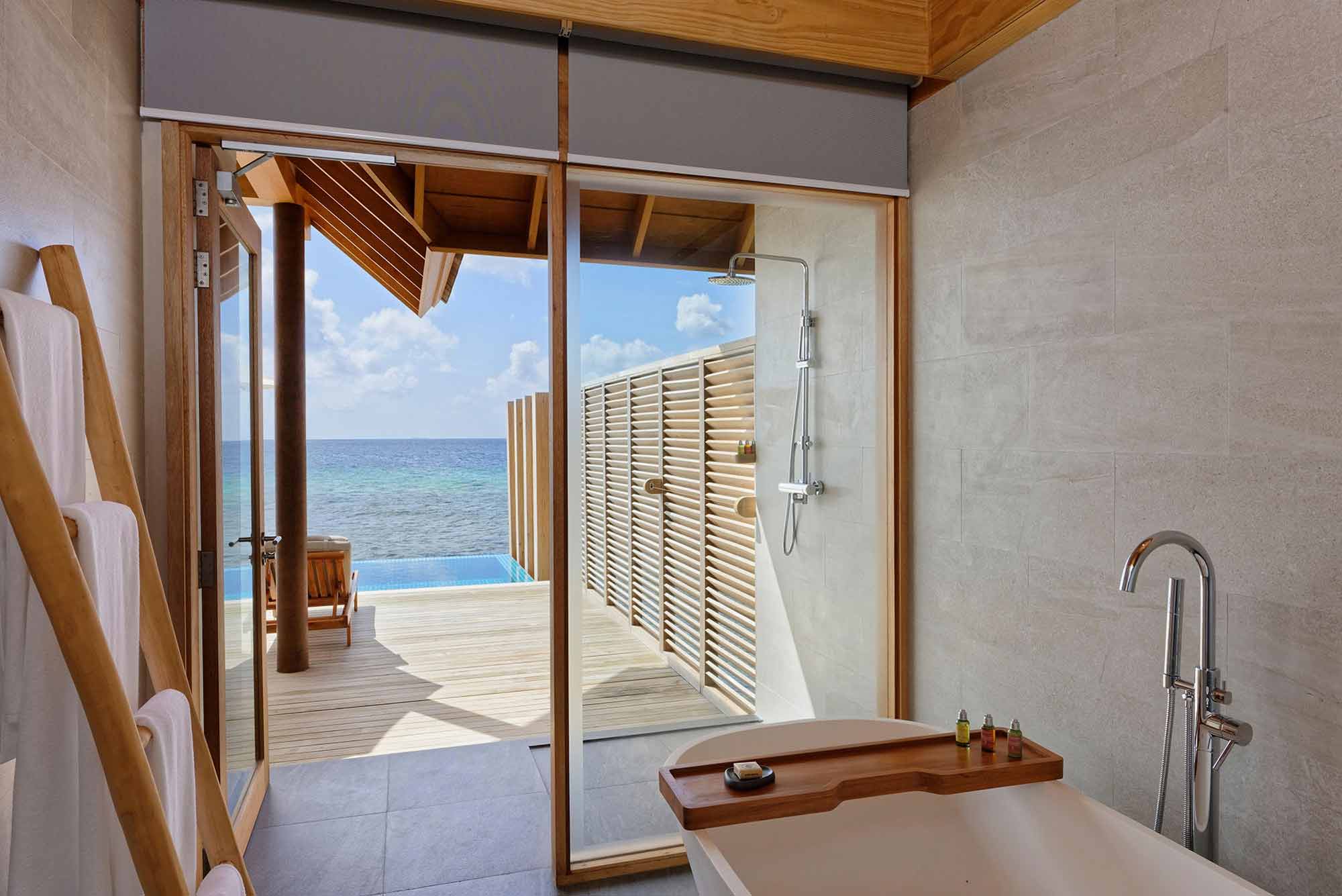 Вилла на берегу. Спальня с кроватью king-size и гостиной зоной, ванная комната с ванной и душевой кабиной, душ на открытом воздухе, терраса.