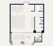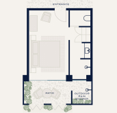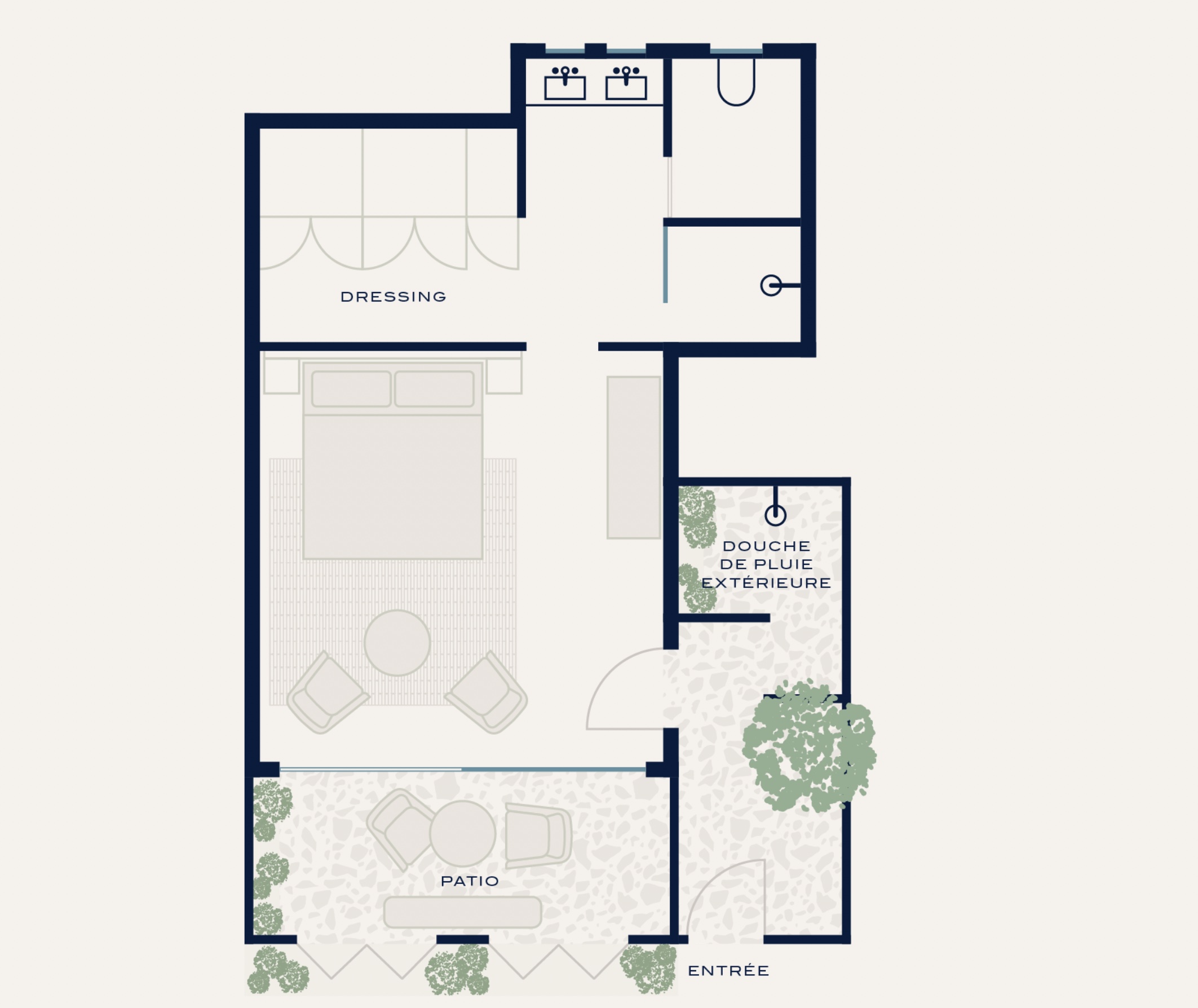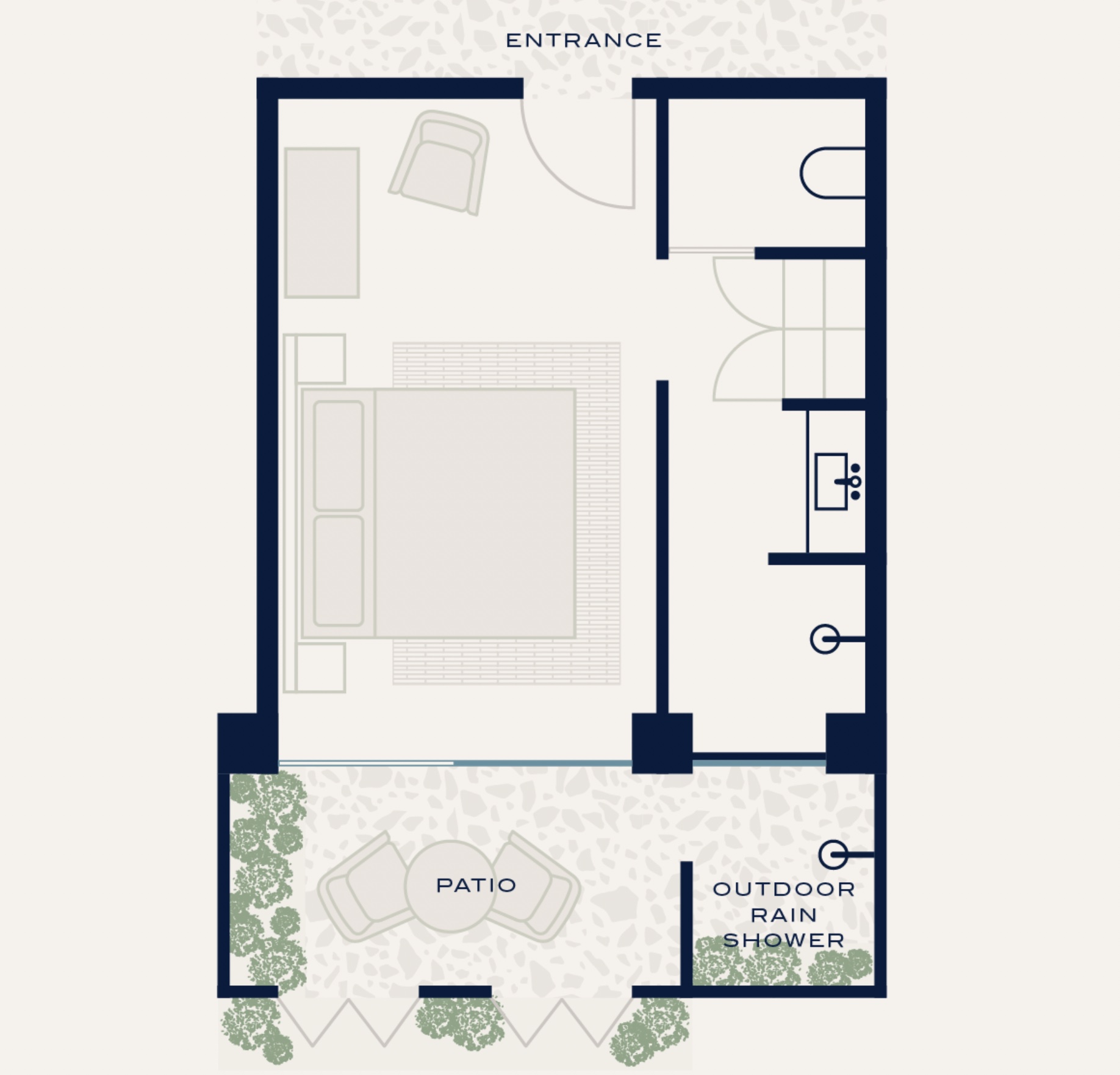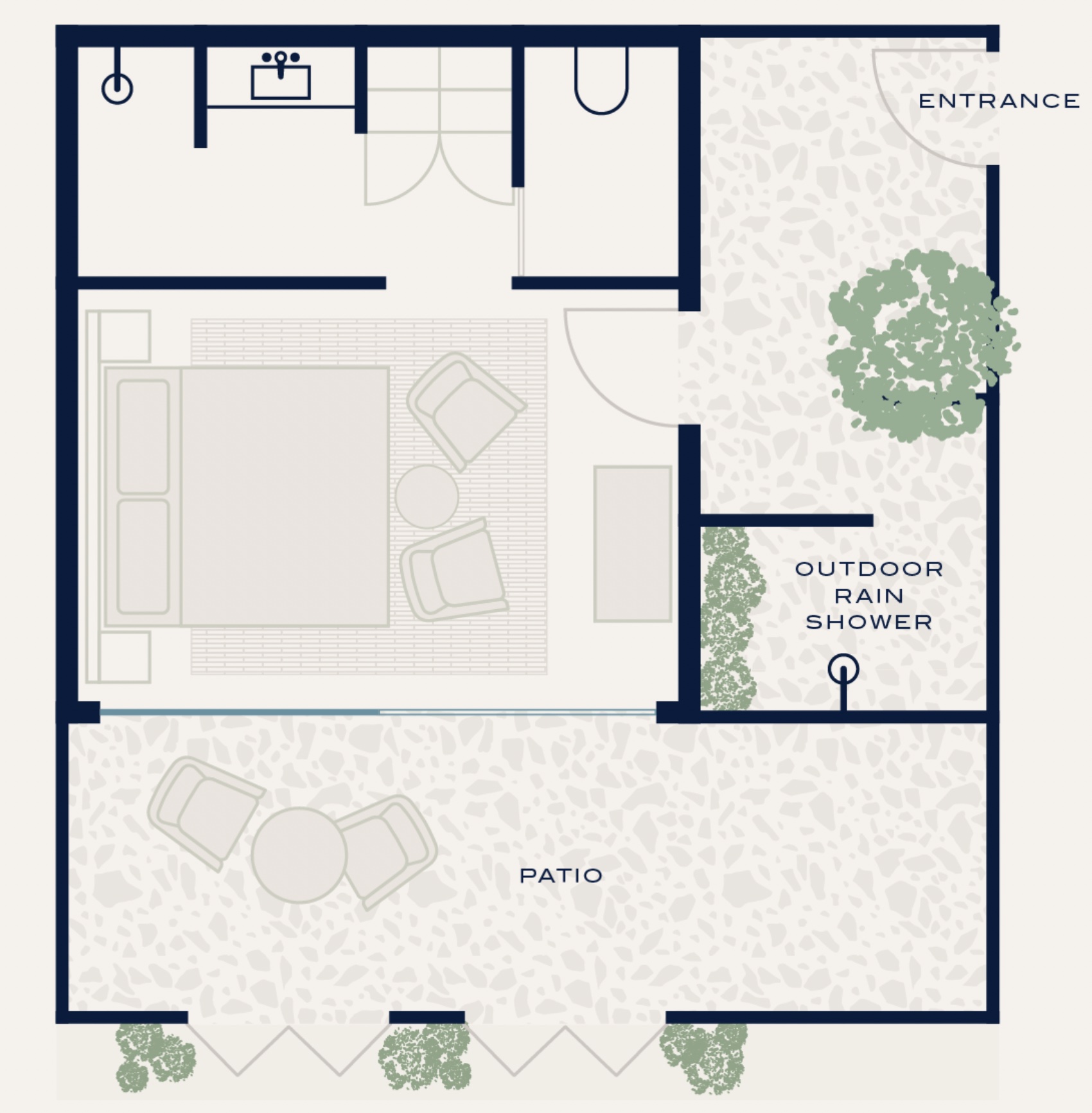 Бунгало в саду. Спальня с кроватью king-size или кроватями twin, гостиная зона, гардеробная, ванная комната с душевой кабиной, патио с душем на открытом воздухе.