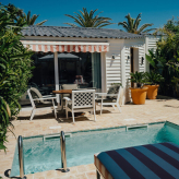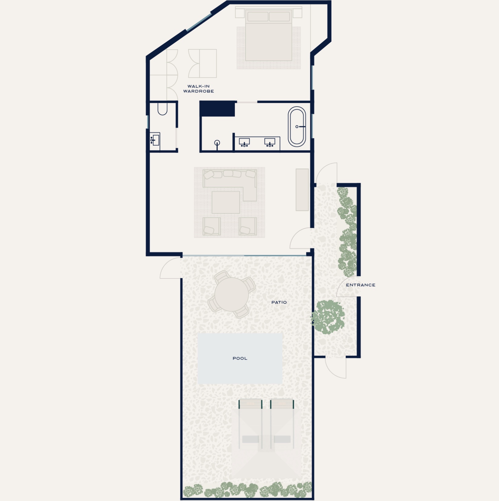 Бунгало в саду. Спальня с кроватью king-size, гостиная, гардеробная, ванная комната с ванной и душевой кабиной, патио с бассейном.