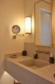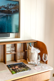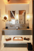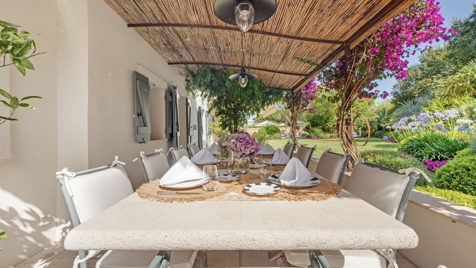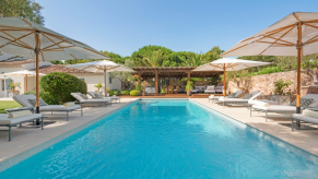 На 1-м этаже: 3 спальни (две – с кроватями queen-size, одна – с кроватью king-size), гостиная с обеденной зоной, кухня, рабочий кабинет, 3 ванные комнаты (каждая с душевой кабиной), гостевой туалет, терраса с бассейном и обеденной зоной на открытом воздухе, домик у бассейна, поле для петанка. Гостиная и спальни разделены дверями.