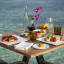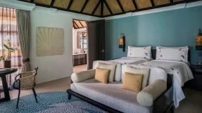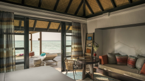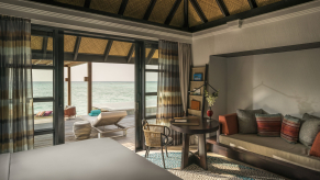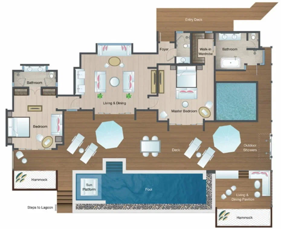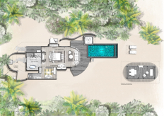 Вилла на воде. 3 спальни (две – с кроватью king-size, одна – с кроватями twin), гостиная с обеденной зоной, 2 гардеробные, 3 ванные комнаты (две – с ванной и душевой кабиной, одна – с душевой кабиной), гостевой туалет, душ на открытом воздухе, терраса с бассейном, обеденной зоной и прямым спуском к воде. Гостиная и спальни разделены дверями.