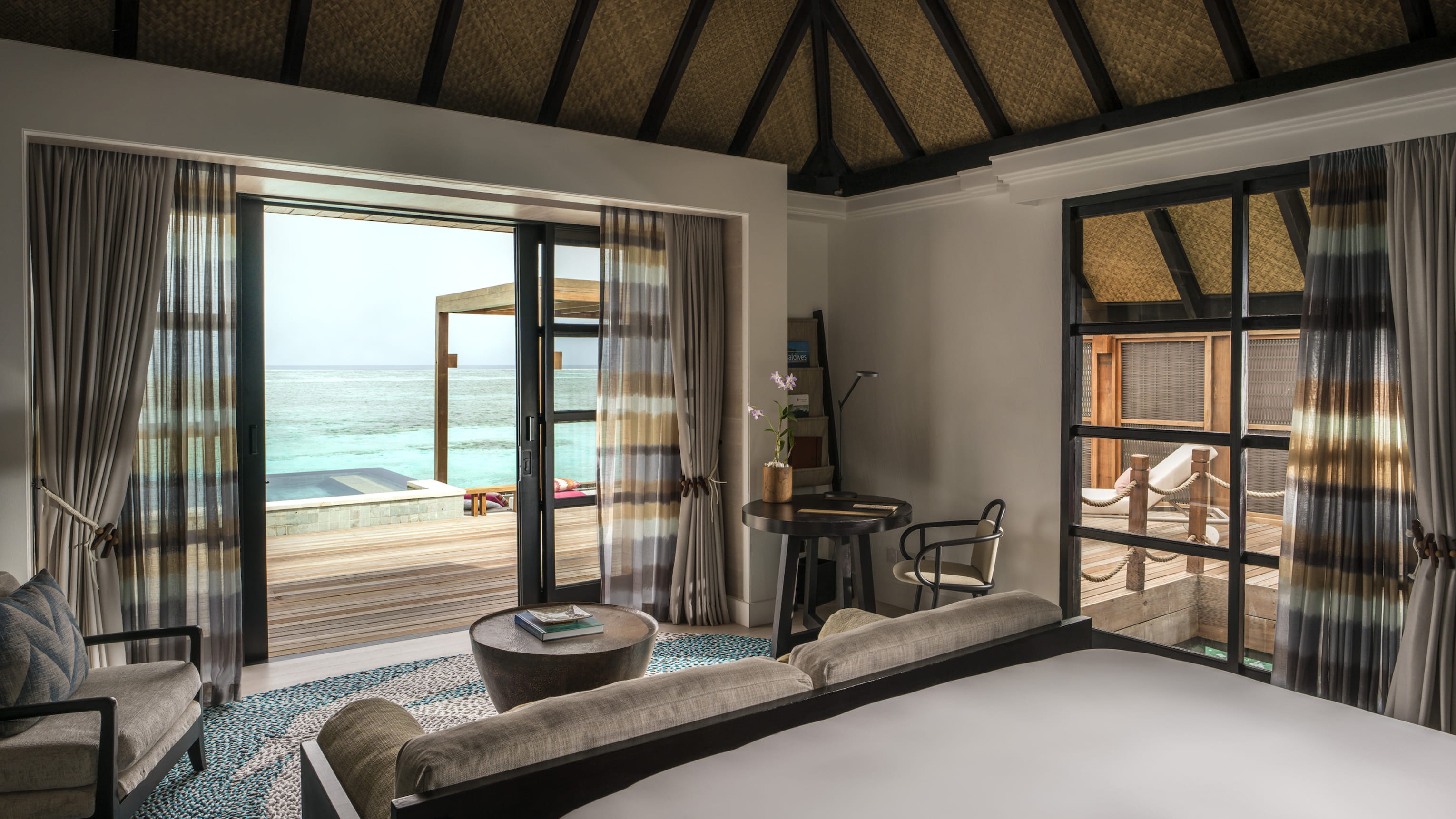 Вилла на воде. 2 спальни (каждая с кроватью king-size), гостиная, гардеробная, 3 ванные комнаты (одна – с ванной и душевой кабиной, две – с душевой кабиной), душ на открытом воздухе, терраса с бассейном и прямым спуском к воде. Гостиная и спальни разделены дверями.