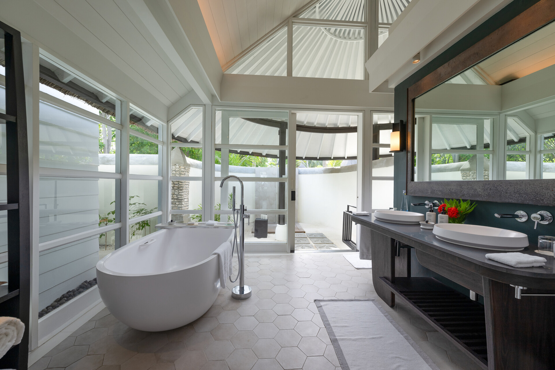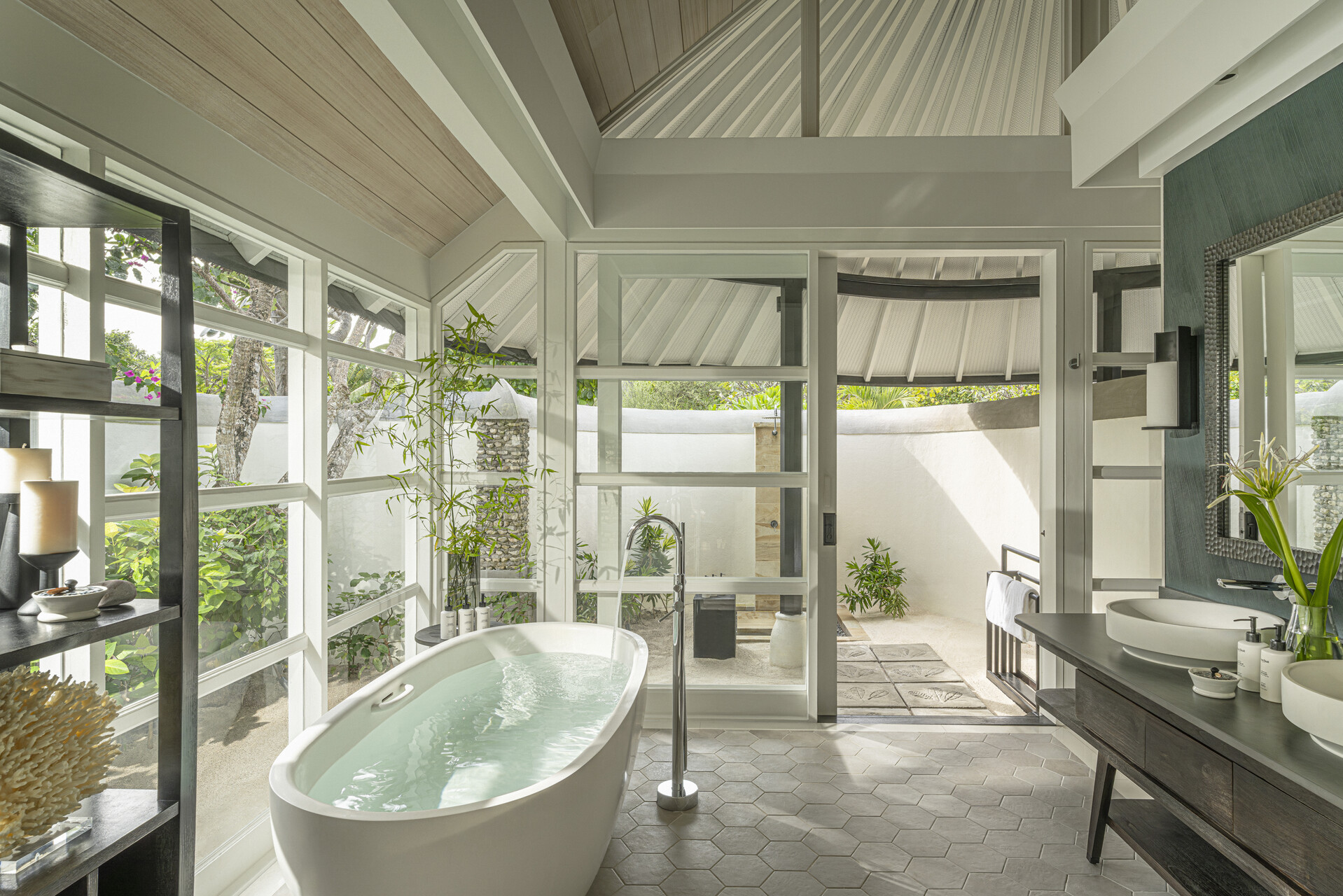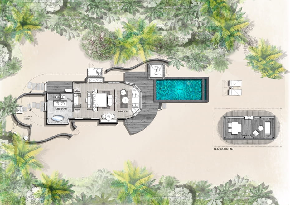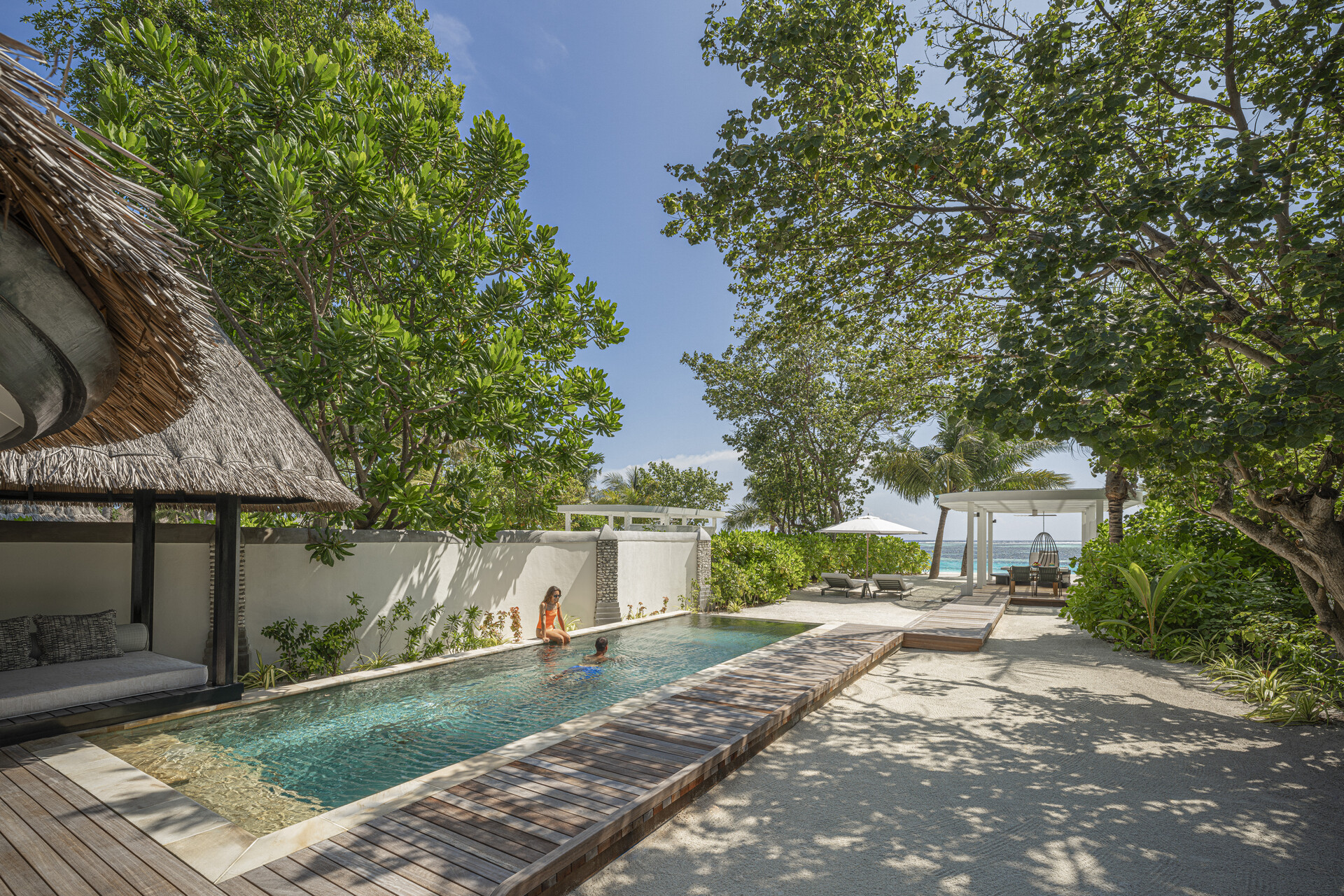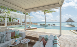 Вилла на берегу. 2 спальни (каждая с кроватью king-size), гостиная, гардеробная, 2 ванные комнаты (одна – с ванной и душем, другая – с душем), душ на открытом воздухе, терраса с бассейном. Гостиная и спальни разделены дверями.