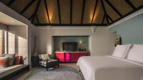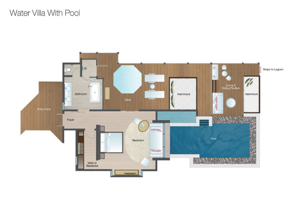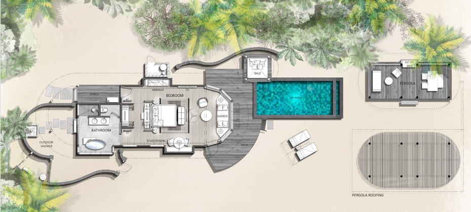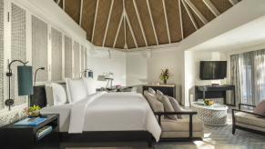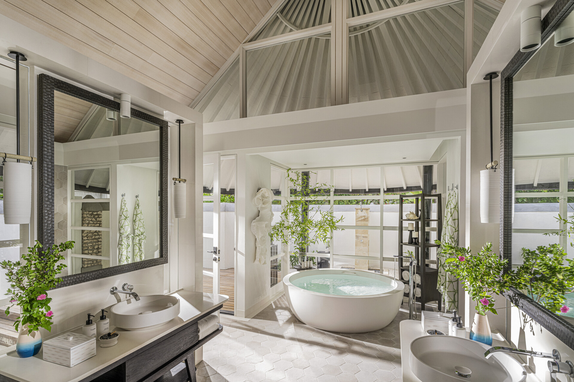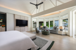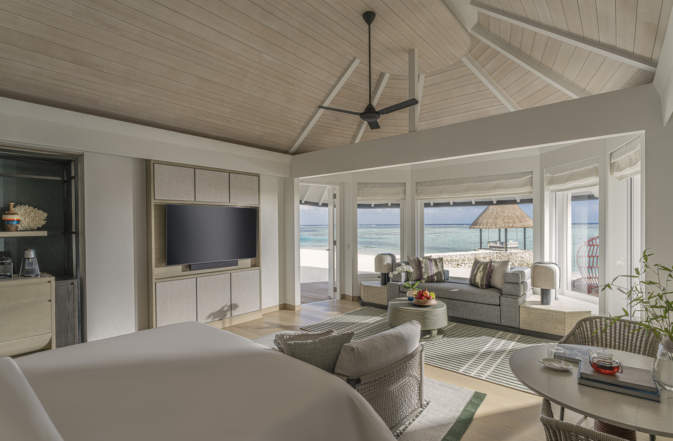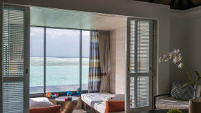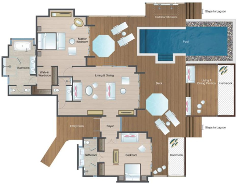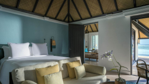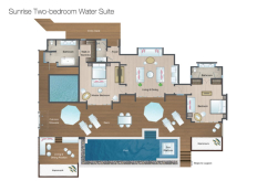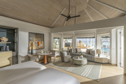 Вилла на воде. 2 спальни (одна – с кроватью king-size, другая – с кроватями twin), гостиная, 2 гардеробные, 3 ванные комнаты (две – с душем, одна – с ванной и душем), душ на открытом воздухе, терраса с бассейном и прямым спуском к воде. Гостиная и спальни разделены дверями.