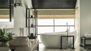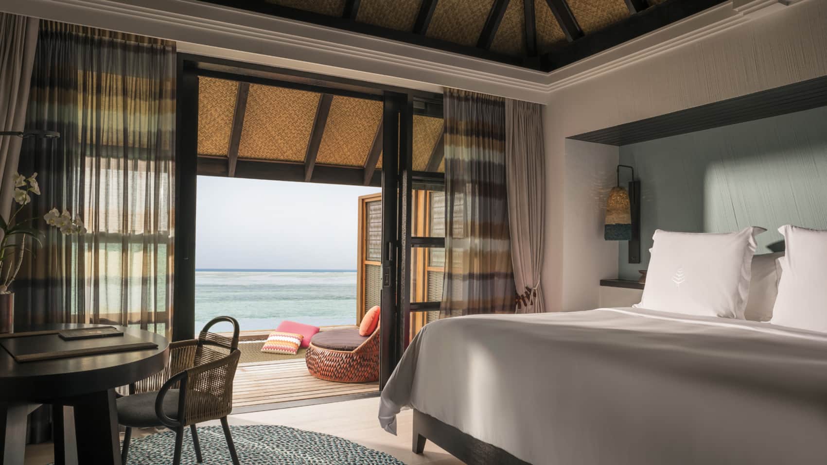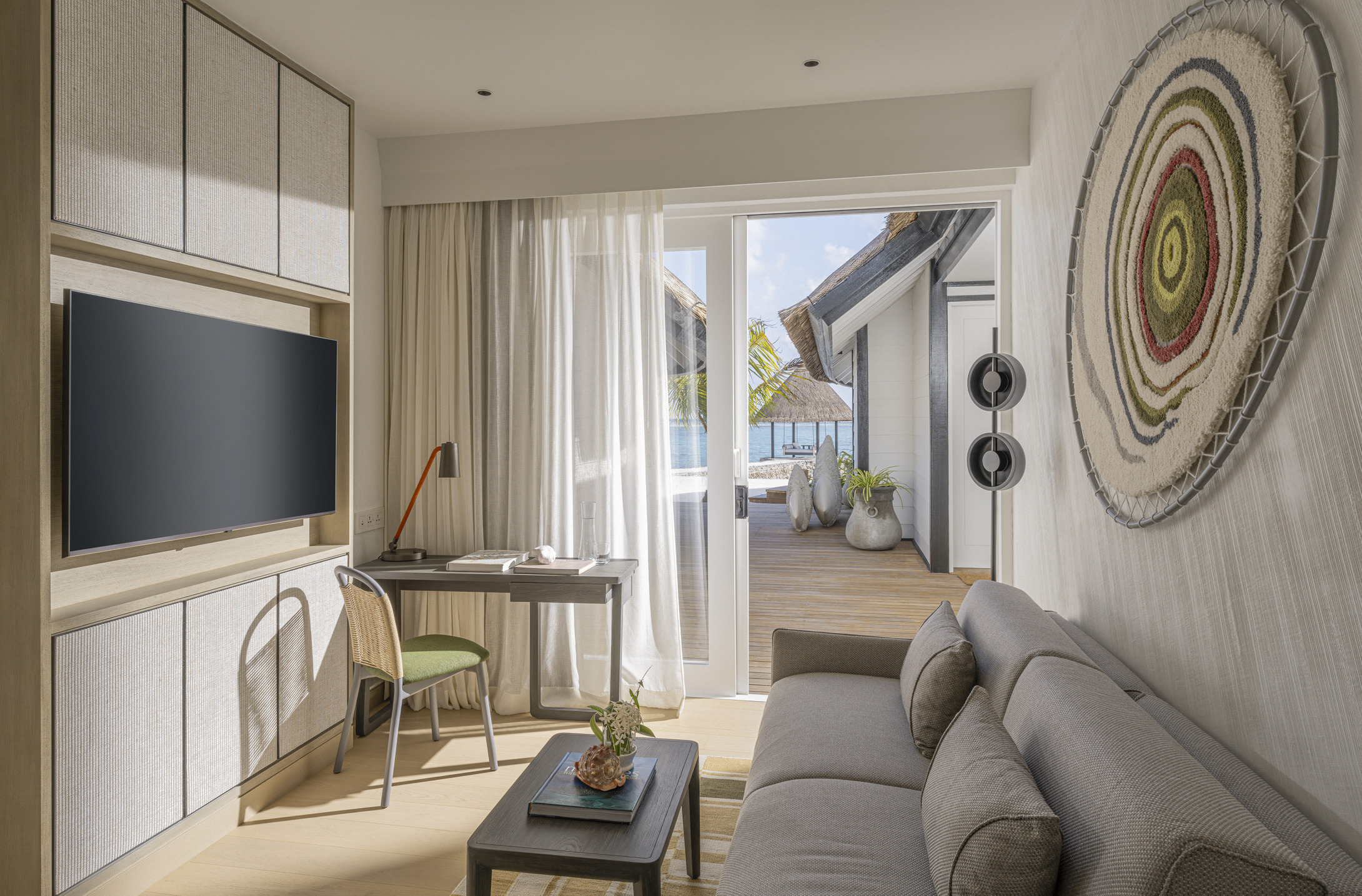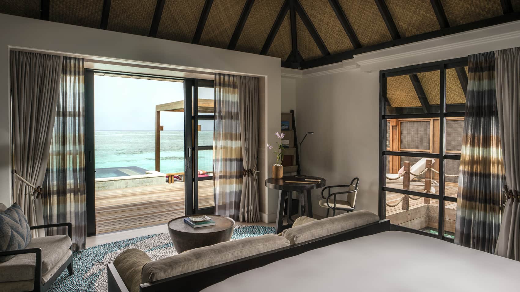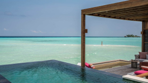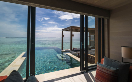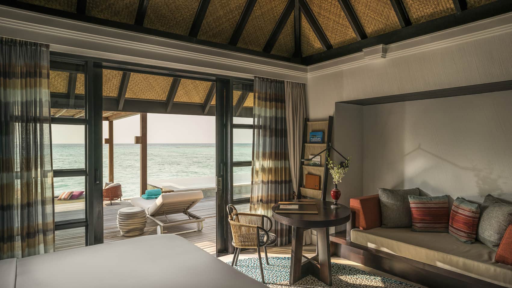 Вилла на воде. 2 спальни (одна – с кроватью king-size, другая – с кроватями twin), гостиная, 2 гардеробные, 3 ванные комнаты (две – с душем, одна – с ванной и душем), душ на открытом воздухе, терраса с бассейном и прямым спуском к воде. Гостиная и спальни разделены дверями.