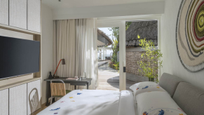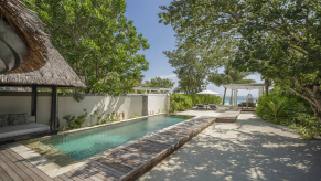 Вилла на берегу. Спальня с кроватью king-size или кроватями twin, ванная комната с ванной, душ на открытом воздухе, терраса в саду с бассейном.