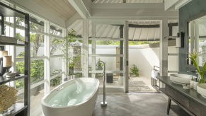 Вилла на берегу. Спальня с кроватью king-size или кроватями twin, ванная комната с ванной и душевой кабиной, душ на открытом воздухе, терраса в саду с бассейном.