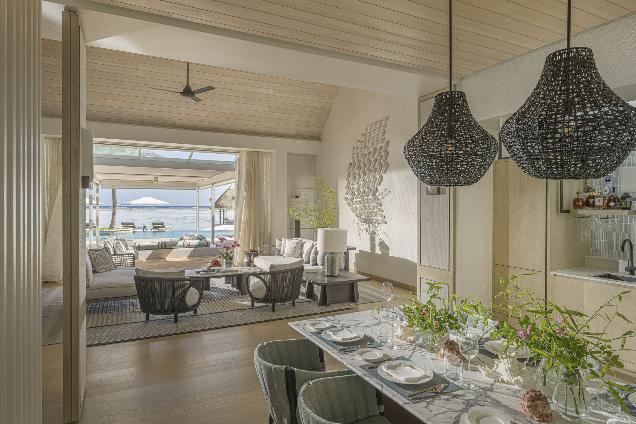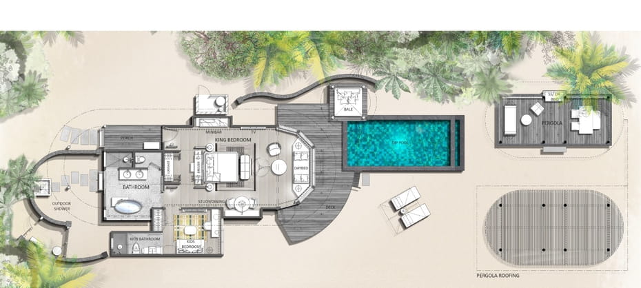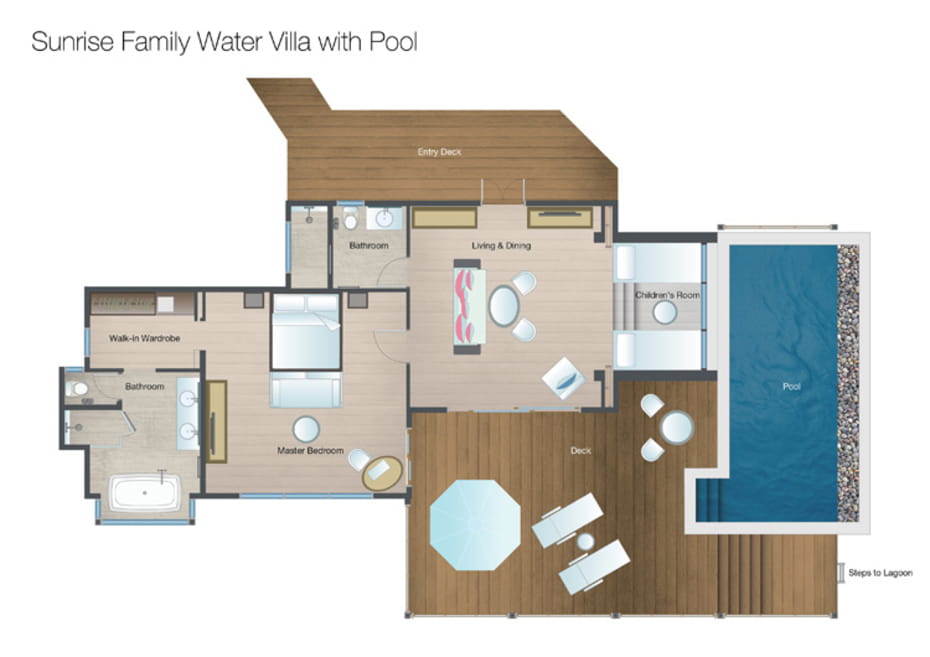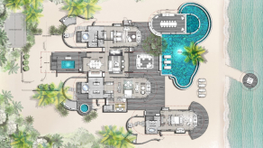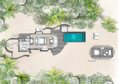 Вилла на воде. 3 спальни (две – с кроватью king-size, одна – с кроватями twin), гостиная, детская комната, 2 гардеробные, 3 ванные комнаты (две – с ванной и душем, одна – с душем), гостевой туалет, душ на открытом воздухе, терраса с бассейном и прямым спуском к воде. Гостиная и спальни разделены дверями.