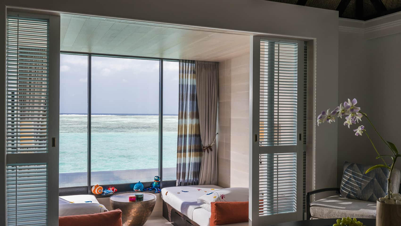 Вилла на воде. 2 спальни (одна – с кроватью king-size, другая – детская спальня с кроватями twin), гостиная, гардеробная, 2 ванные комнаты (одна – с ванной и душем, другая – с душем), душ на открытом воздухе, терраса с бассейном и прямым спуском к воде. Гостиная и спальни разделены дверями.