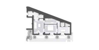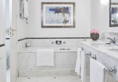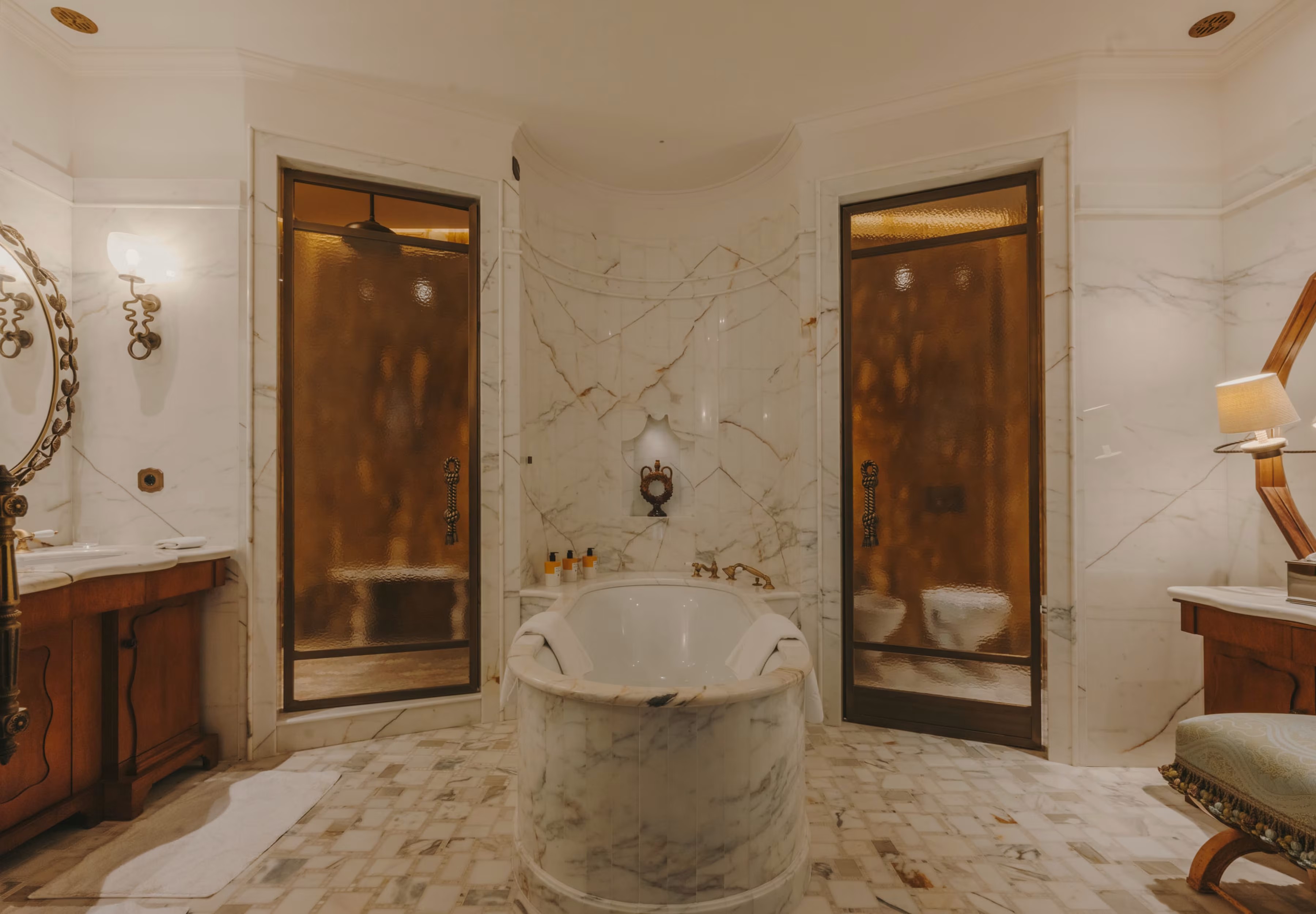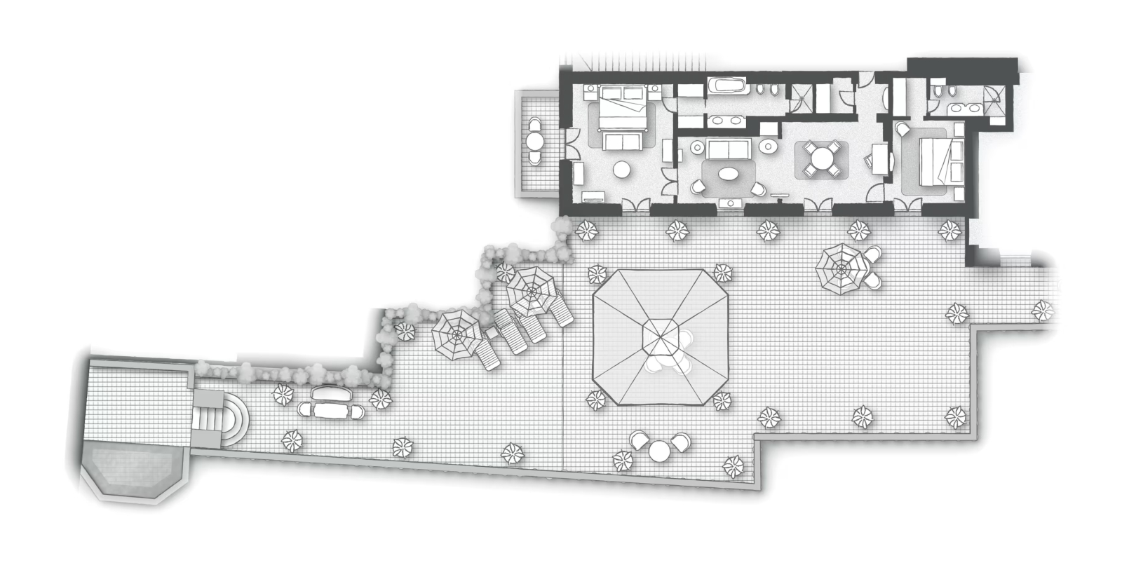2 спальни с кроватями king-size, гостиная с обеденной зоной, 2 ванные комнаты (каждая с ванной и душевой кабиной), терраса с джакузи. Гостиная и спальни разделены дверями.