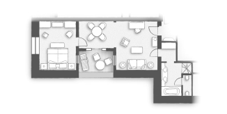 Спальня с кроватью king-size или кроватями twin, гостиная с обеденной зоной (стол на 3 персоны), ванная комната с ванной и душевой кабиной, балкон или терраса. Гостиная и спальня разделены дверью.