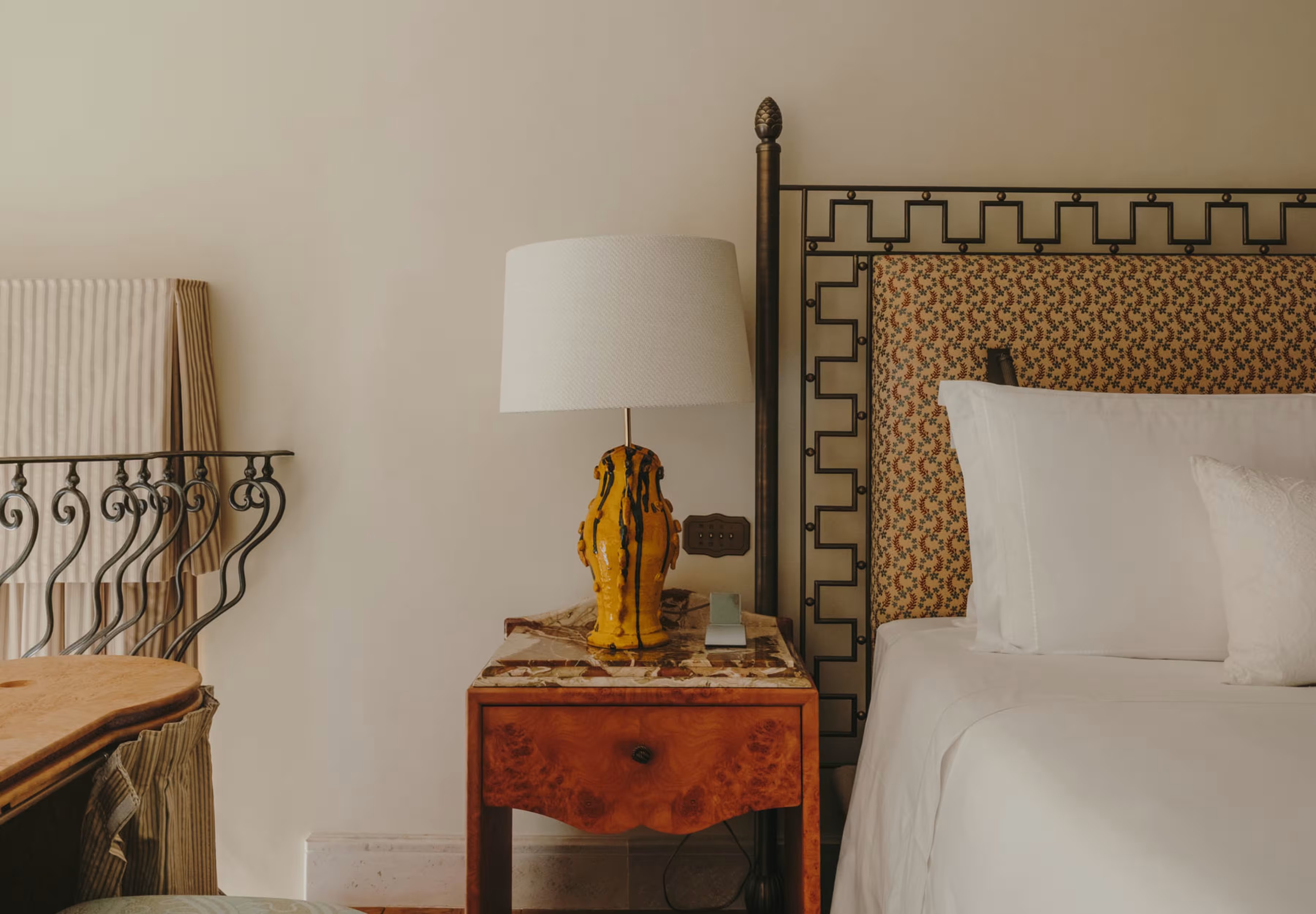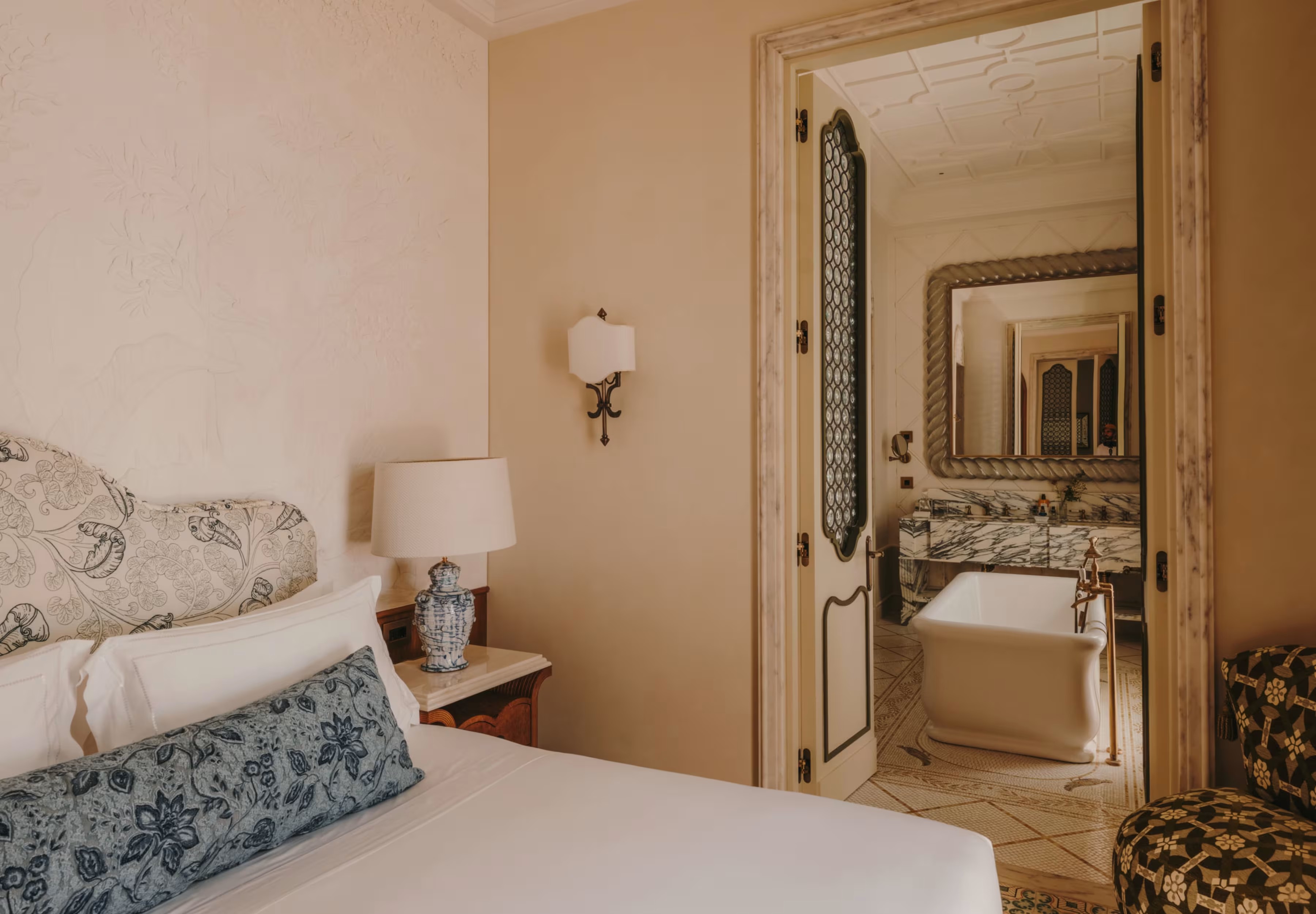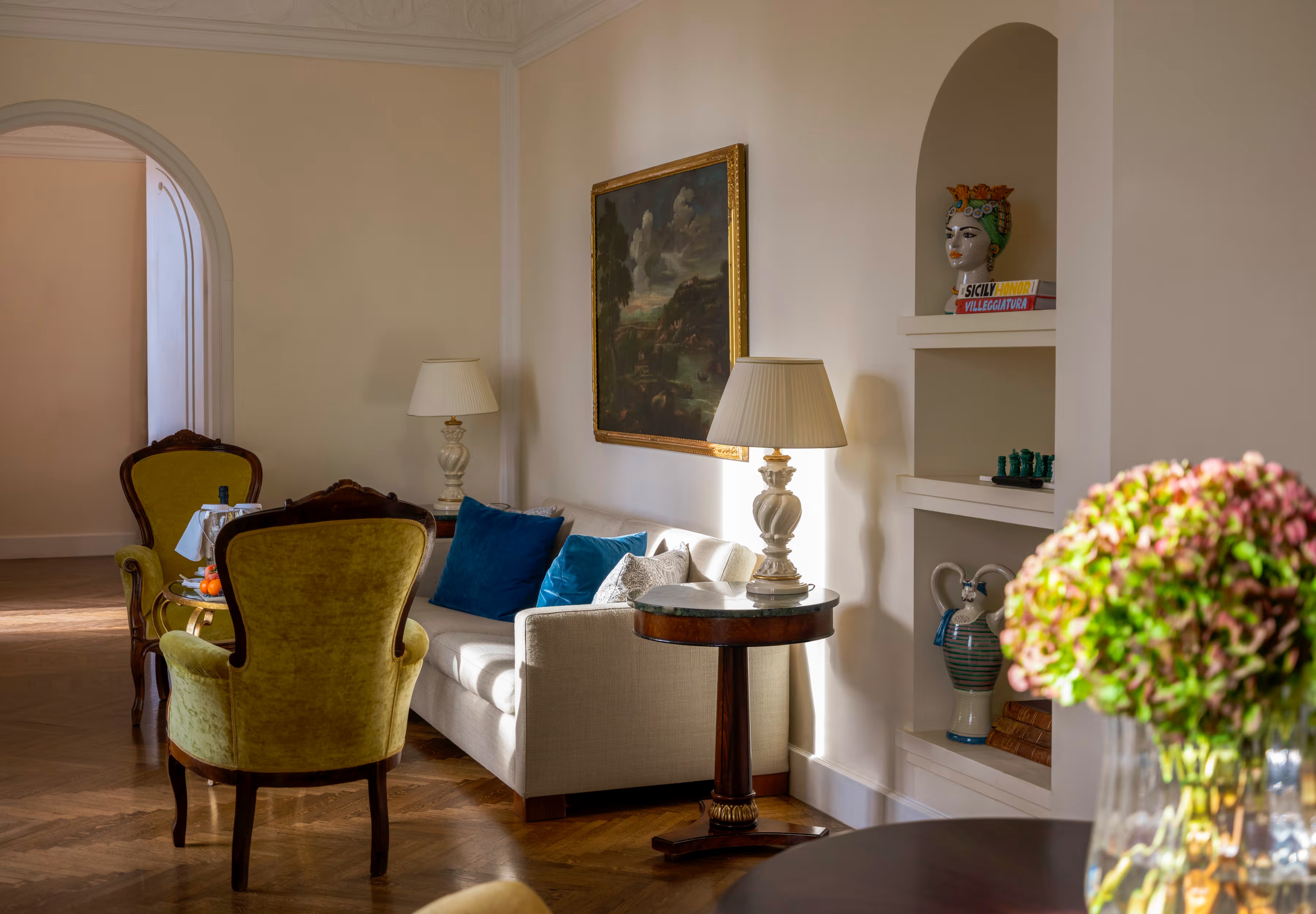 Здание, выдержанное в традициях сицилийского барокко, окружает частный парк площадью более 2 га. Номера распределены между историческим главным корпусом и виллой Timeo. Интерьеры первого следуют барочному канону: антикварная мебель, картины в позолоченных рамах, изящные бра-канделябры и ванные комнаты, отделанные благородным мрамором. В сезоне 2026 года вилла Timeo предстанет в обновлённом облике: всемирно известный дизайнер Лаура Гонсалес переосмыслила её пространства, черпая вдохновение в многовековой истории Сицилии и ярких орнаментах майолики. Туалетные принадлежности в ванных комнатах предоставлены итальянским парфюмерным домом Acqua di Parma.