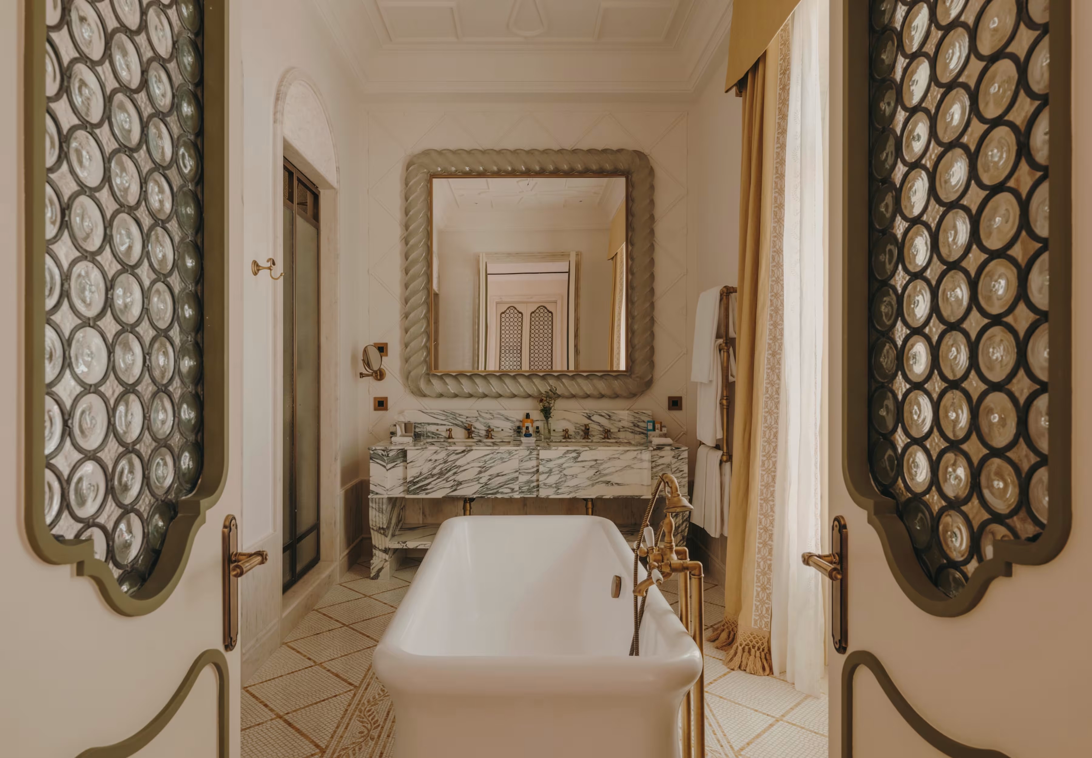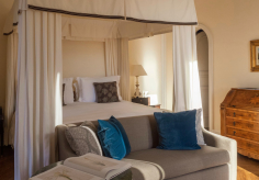 Спальня с кроватью king-size, гостиная с обеденной зоной, ванная комната с гидромассажной ванной и душевой кабиной, гостевой туалет, терраса, частный сад, бассейн. Гостиная и спальня разделены дверью.
