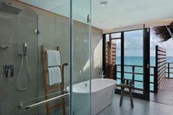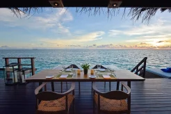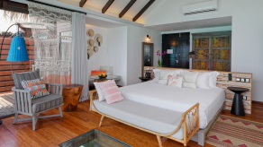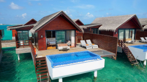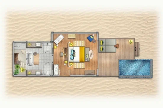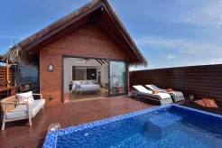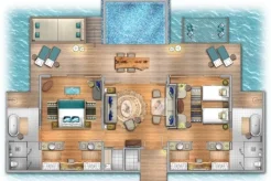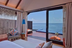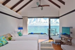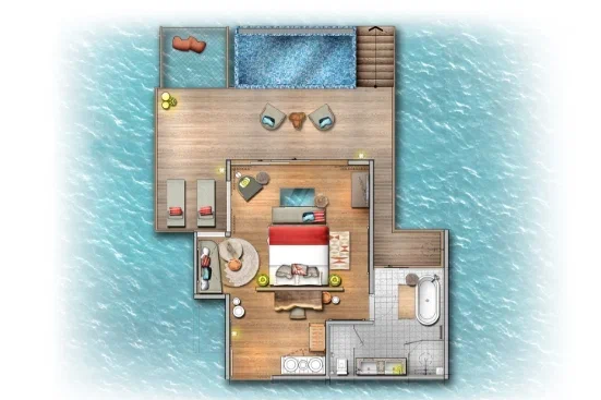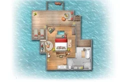 Вилла на воде. 2 спальни (одна – с кроватью king-size и прозрачной панелью в полу для наблюдения за жизнью океана, другая – с кроватями twin), гостиная, обеденная зона на открытом воздухе, мини-кухня, 2 ванные комнаты (каждая с ванной и душевой кабиной), душ на открытом воздухе, терраса с бассейном, гамак над водой. Прямой спуск к воде. Гостиная и спальни разделены дверями.