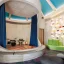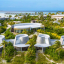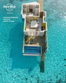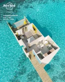 Вилла на воде. Спальня с кроватью king-size и балдахином, гостиная с обеденной зоной, музыкальным автоматом и прозрачной панелью в полу для наблюдения за жизнью океана, кухня, ванная комната с ванной и душевой кабиной, душ на открытом воздухе, терраса с бассейном, гамаком над водой, обеденной зоной на открытом воздухе и баром, стилизованным под фургончик, прямой спуск к воде, частный причал. Гостиная и спальня разделены дверью.