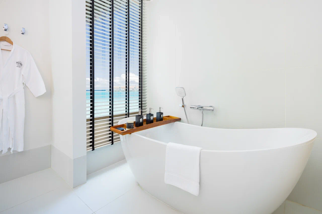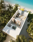Вилла на воде. 2 спальни (одна – с кроватью king-size, другая – с кроватями twin), гостиная с обеденной зоной, 2 ванные комнаты (одна – с ванной и душевой кабиной, другая – с душевой кабиной), терраса с бассейном, гамаком над водой и прямым спуском к воде. Гостиная и спальни разделены дверями.
