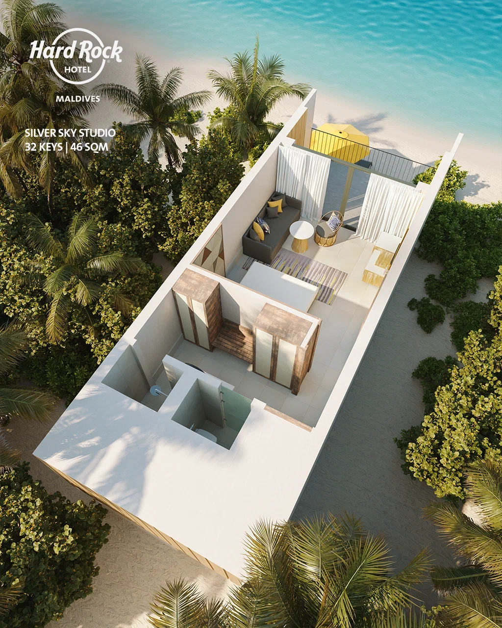 В отеле Hard Rock Hotel Maldives всё пронизано любовью к музыке. Главный бассейн оснащён подводной акустикой. По запросу предоставляются гитары Fender. Каждый вечер – живая музыка и диджей-сеты у бассейна и на террасах. В Rock Spa® проводят фирменные процедуры Rhythm & Motion®: массаж синхронизирован с плейлистом, используется виброакустический эффект. В отеле действуют три ресторана, включая легендарное Hard Rock Cafe. Также гости могут пользоваться инфраструктурой отеля SAii Lagoon Maldives и The Marina@Crossroads. Работает детский клуб, предусмотрены занятия для подростков. Отель предлагает размещение в том числе по системам «всё включено» и «премиум всё включено».