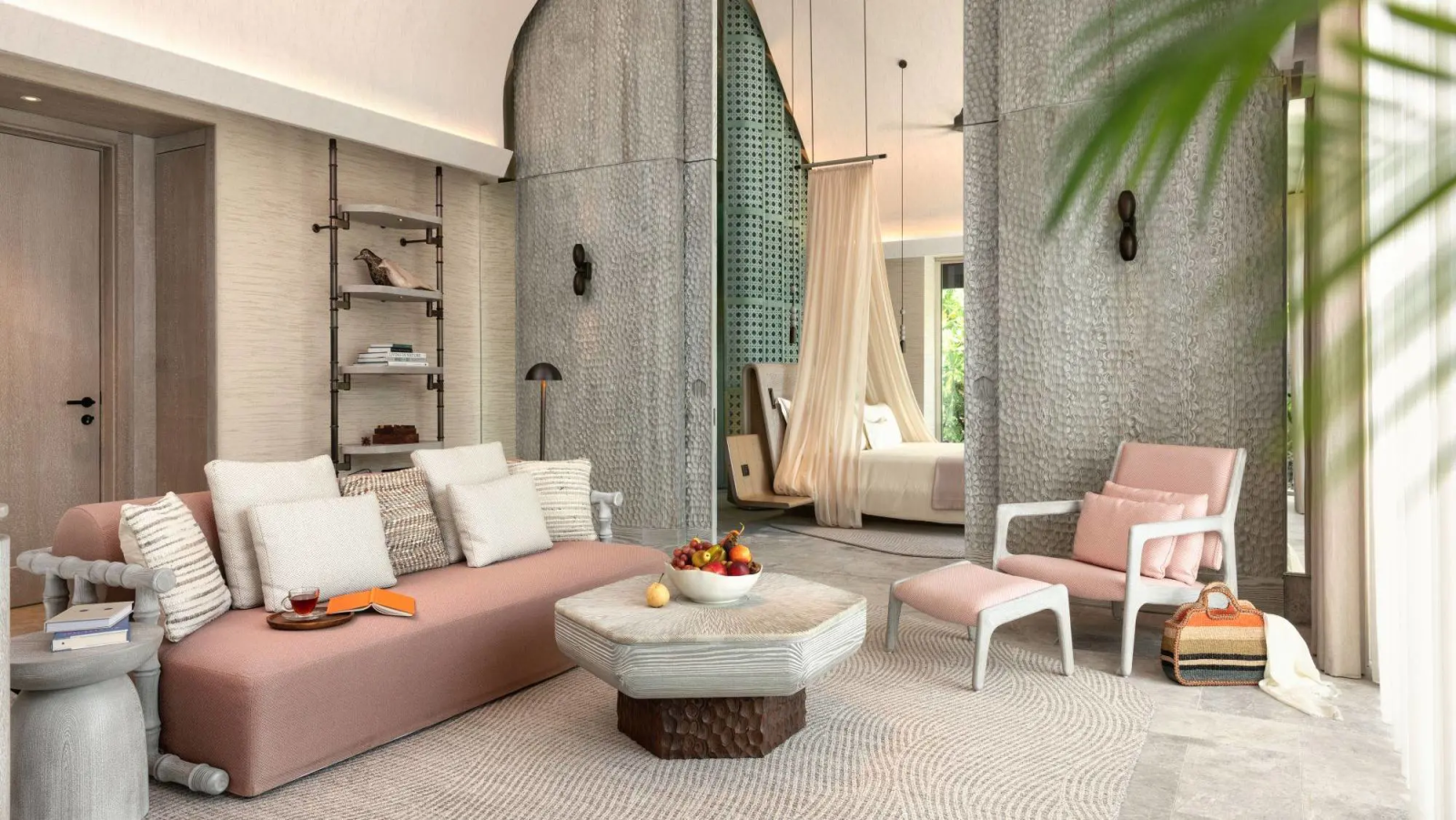 Вилла на берегу. Спальня с кроватью king-size, гостиная, ванная комната с душевой кабиной, ванна и душ на открытом воздухе, терраса с качелями и частным открытым бассейном. Гостиная и спальня разделены дверью.