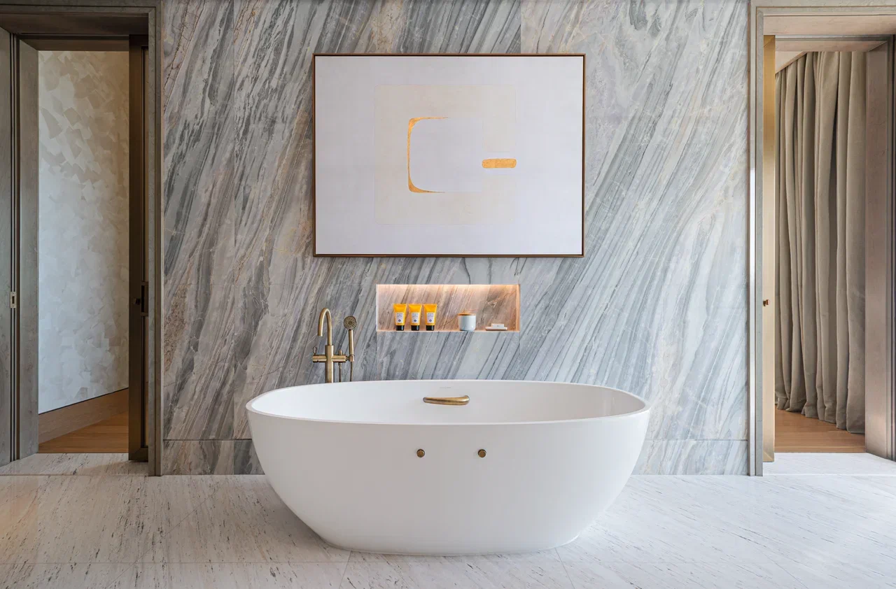 Спальня с кроватью king-size, гостиная с обеденной зоной, ванная комната с ванной и душевой кабиной, гостевой туалет, терраса. Гостиная и спальня разделены дверью.