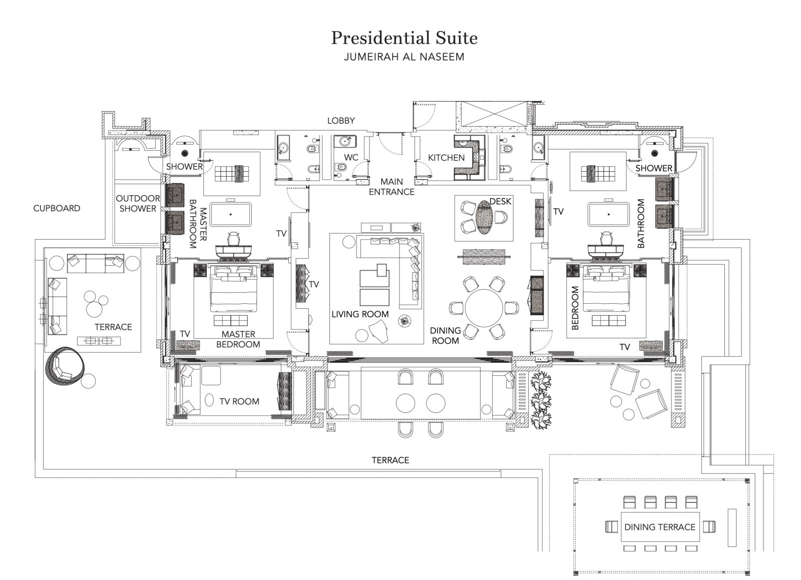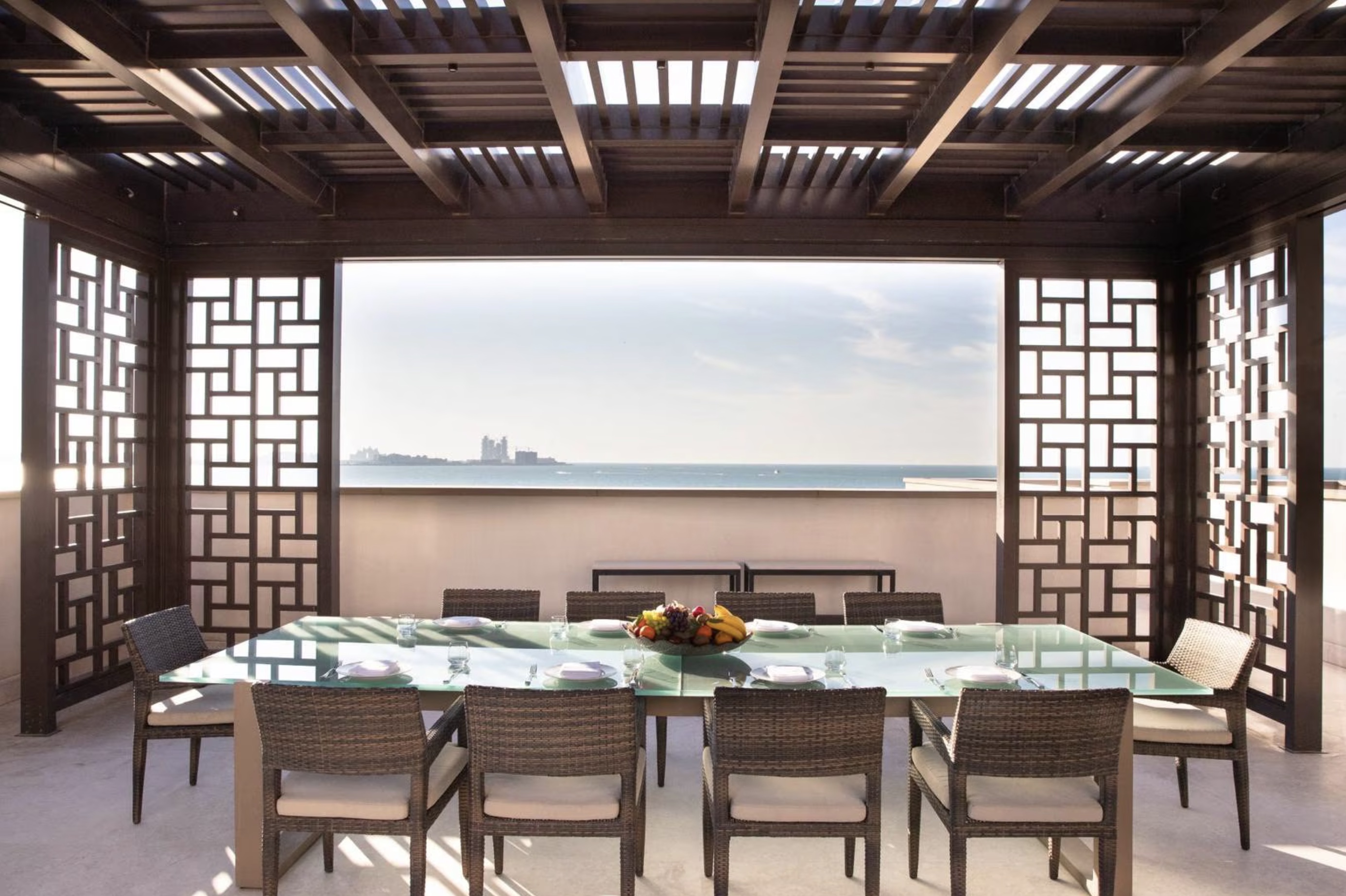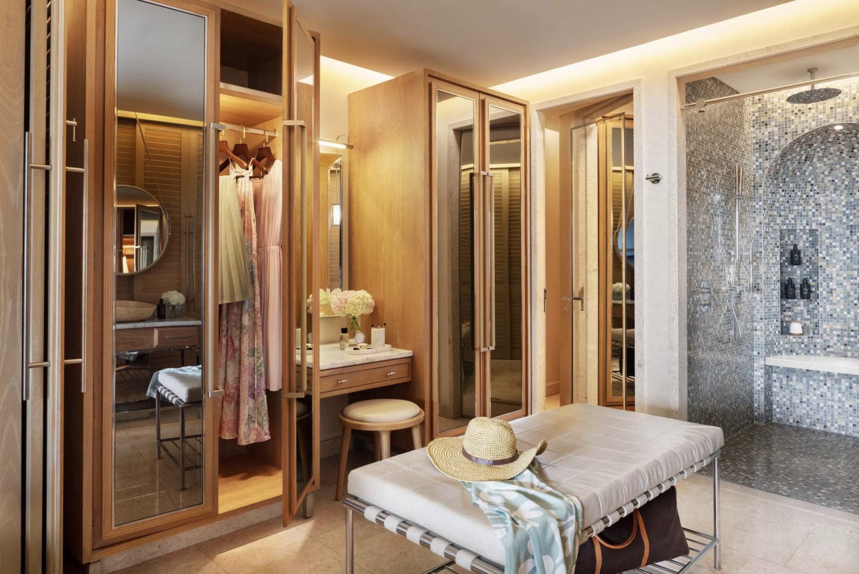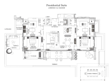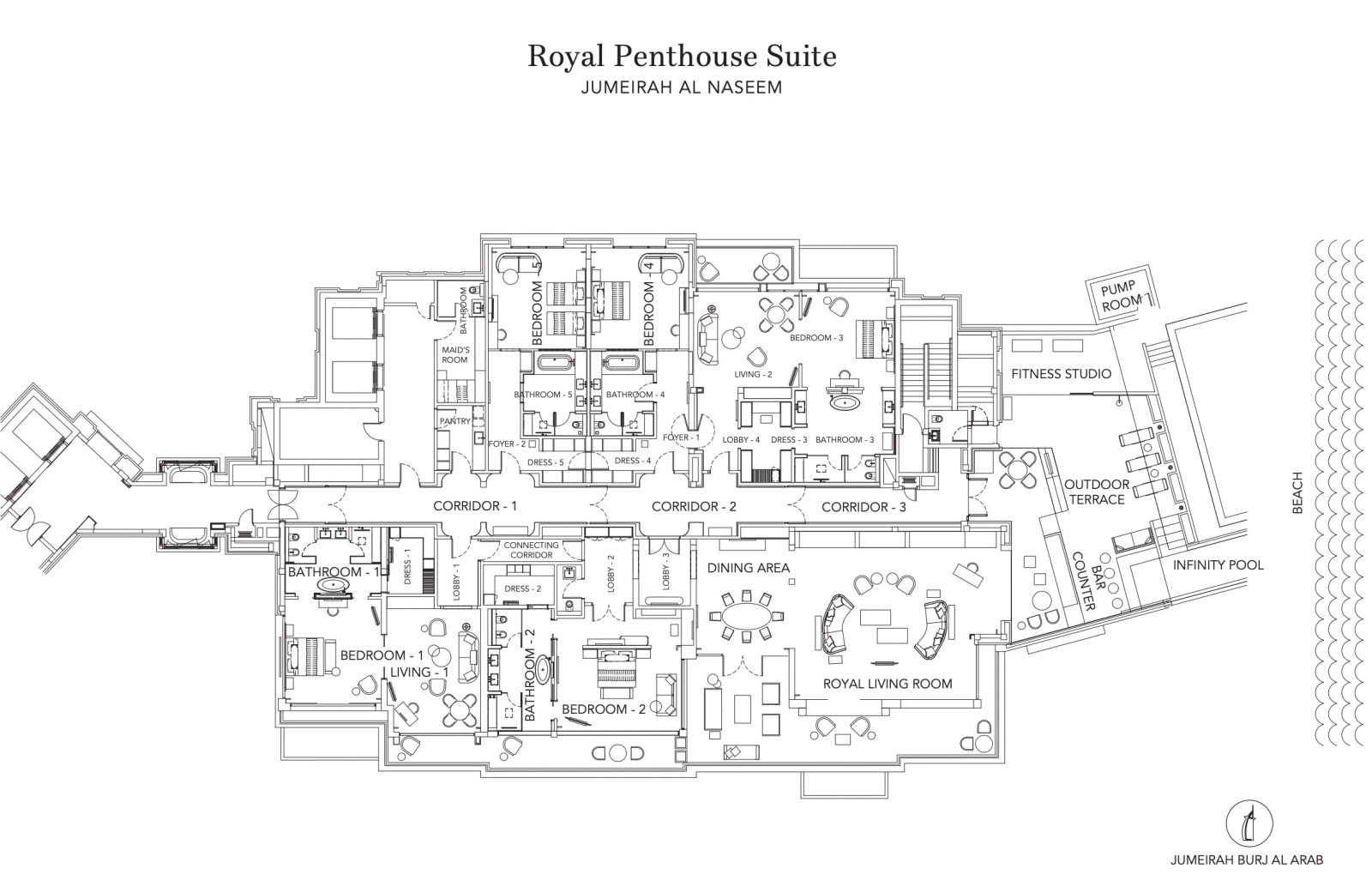5 спален (четыре – с кроватями king-size, одна – с кроватями twin), 3 гостиные с обеденными зонами (в главной – стол на 8 персон), 5 гардеробных, тренажёрный зал, 5 ванных комнат (каждая с ванной и душевой кабиной), гостевой туалет, комната для обслуживающего персонала, балконы, терраса с инфинити-бассейном и баром на открытом воздухе, частный лифт. Гостиные и спальни разделены дверями.