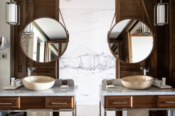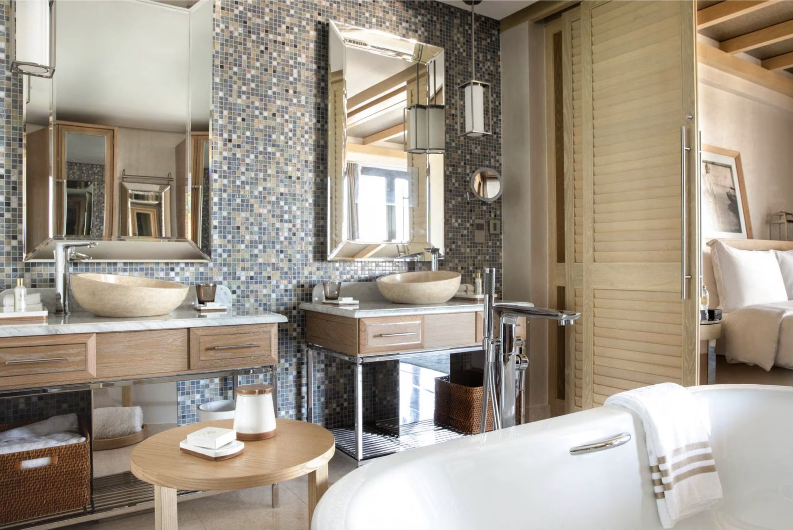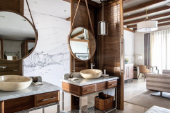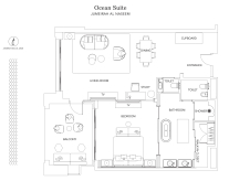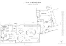 Спальня с кроватью king-size, гостиная с обеденной зоной (стол на 8 персон), гардеробная, тренажёрный зал, ванная комната с ванной и душевой кабиной, гостевой туалет, балконы, терраса с инфинити-бассейном и баром на открытом воздухе, частный лифт. Гостиная и спальня разделены дверью.