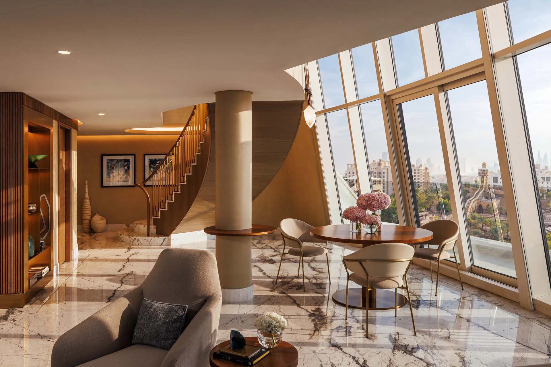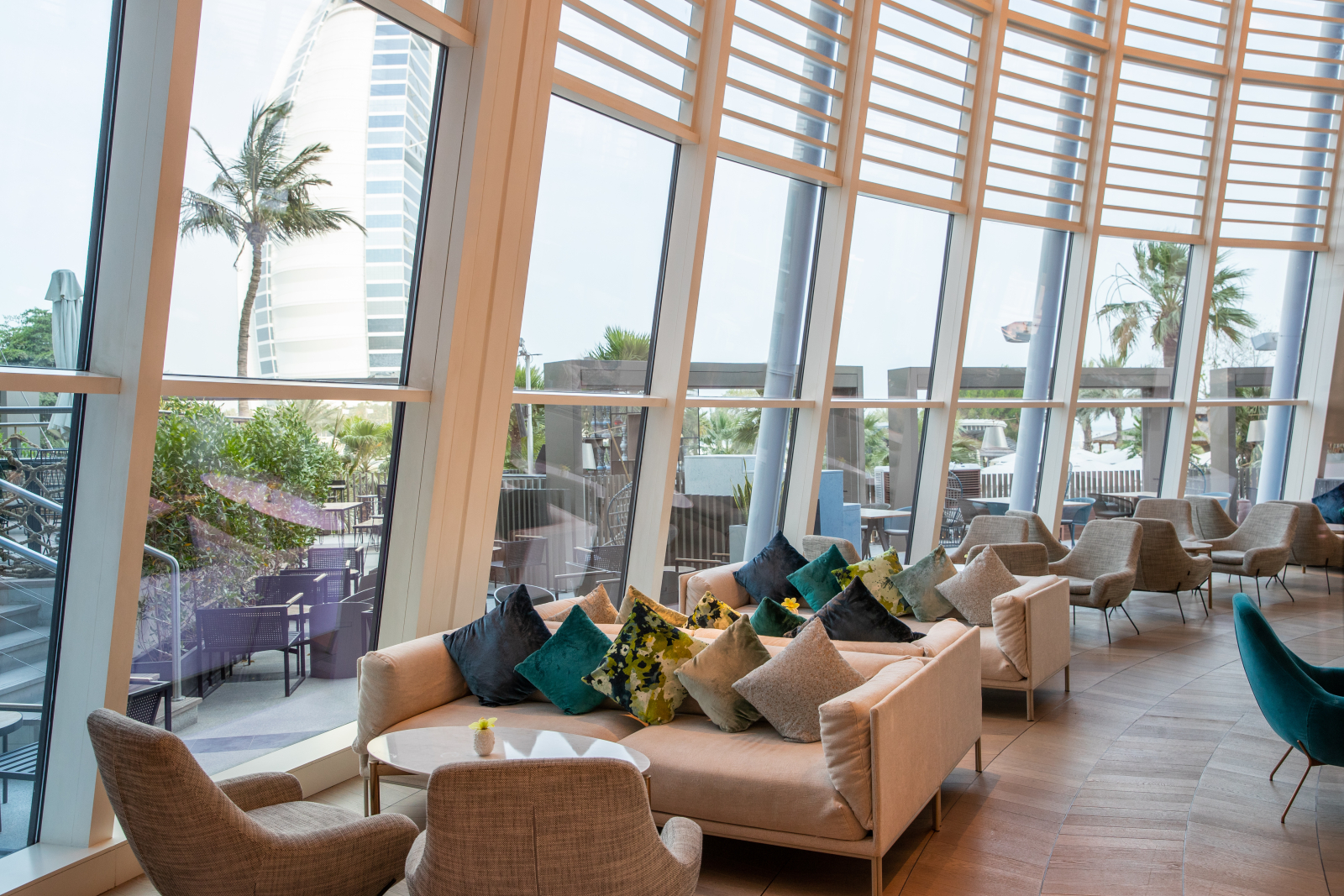 Отель входит в сеть Jumeirah Hotels & Resorts. Его 26-этажное здание в форме волны, созданное бюро WS Atkins & Partners, – один из архитектурных символов Дубая, как и возвышающийся напротив небоскрёб Burj Al Arab. Это один из первых люксовых курортов эмирата, который на протяжении почти 30 лет неизменно держит высокую планку. Фасад основного здания практически полностью отделан стеклом, в котором отражаются воды Персидского залива. В интерьерах номеров преобладает лаконичный дизайн в песочной палитре с акцентами синего цвета.
