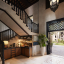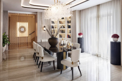 На 1-м этаже: гостиная с обеденной зоной (стол на 8 персон), кухня, рабочий кабинет, гостевой туалет, комната для обслуживающего персонала, терраса с бассейном и обеденной зоной на открытом воздухе.