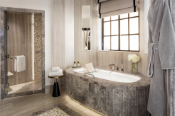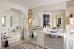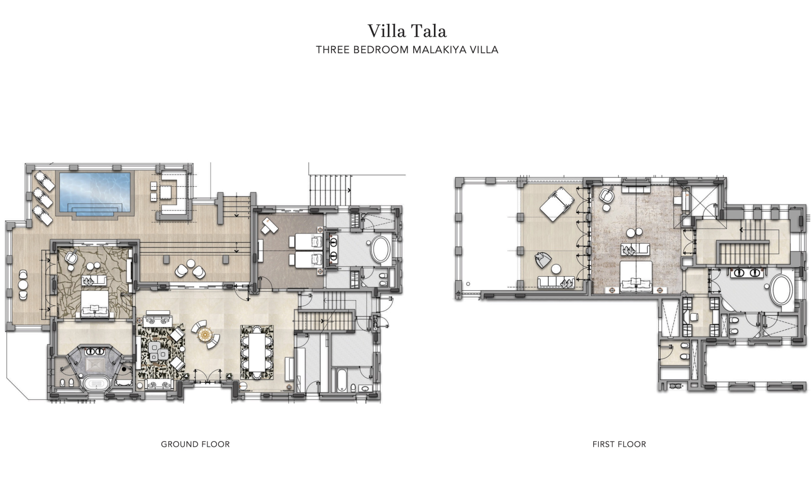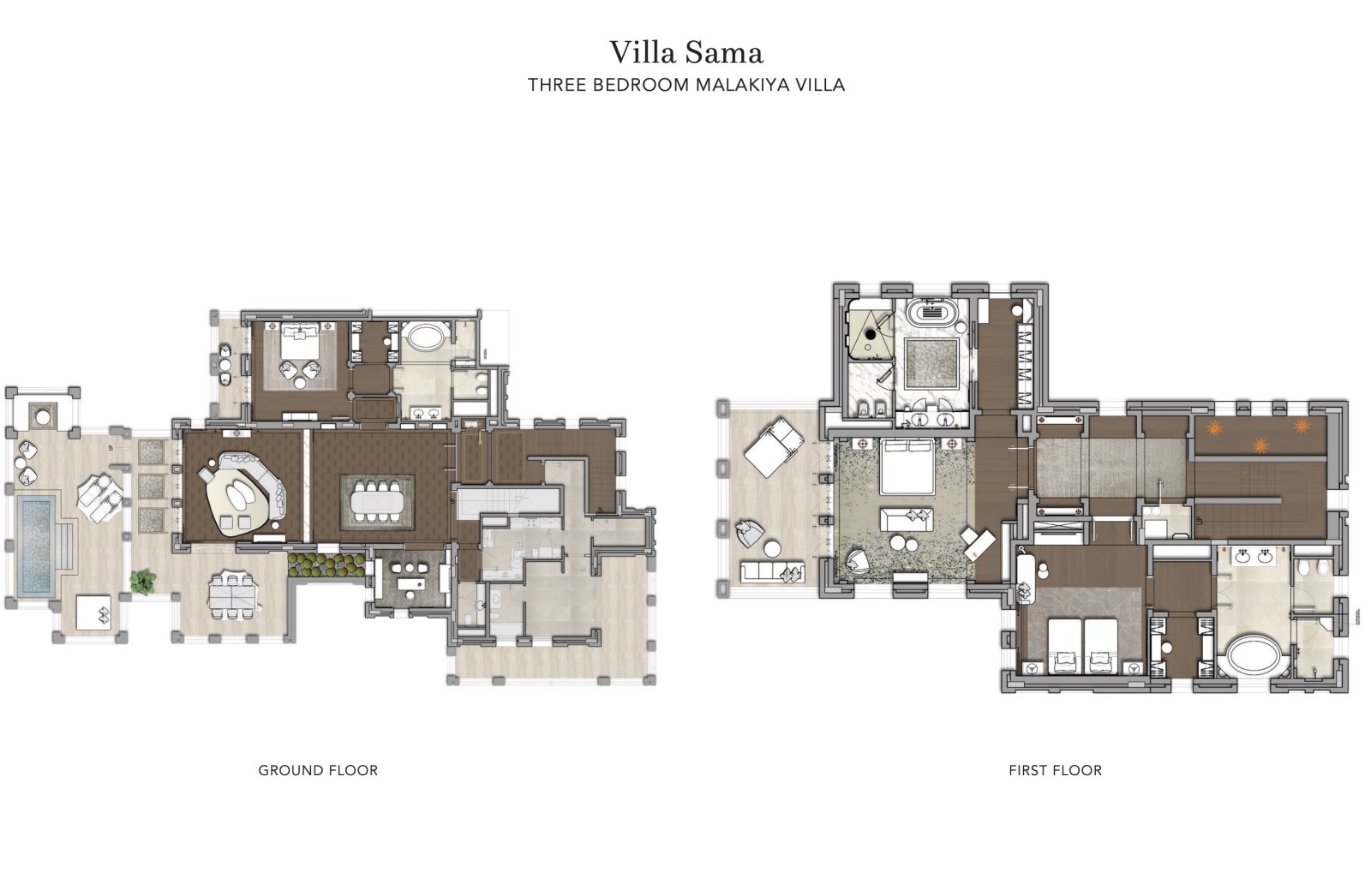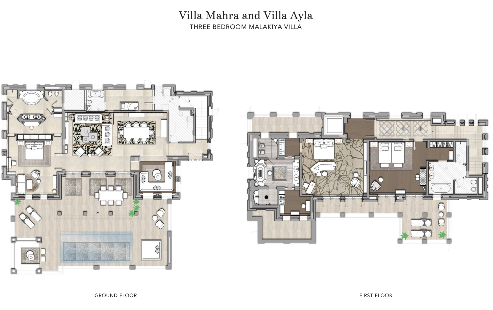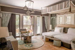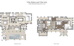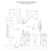 Вилла в саду. 2 спальни (одна – с кроватью king-size, другая – с кроватями twin), гостиная с обеденной зоной (стол на 8 персон), гардеробная, 2 ванные комнаты (каждая с ванной и душевой кабиной), гостевой туалет, терраса с бассейном. Гостиная и спальни разделены дверями.