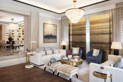 Спальня с кроватью king-size, гостиная с обеденной зоной, гардеробная, ванная комната с ванной и душевой кабиной, гостевой туалет, балкон. Гостиная и спальня разделены дверью.