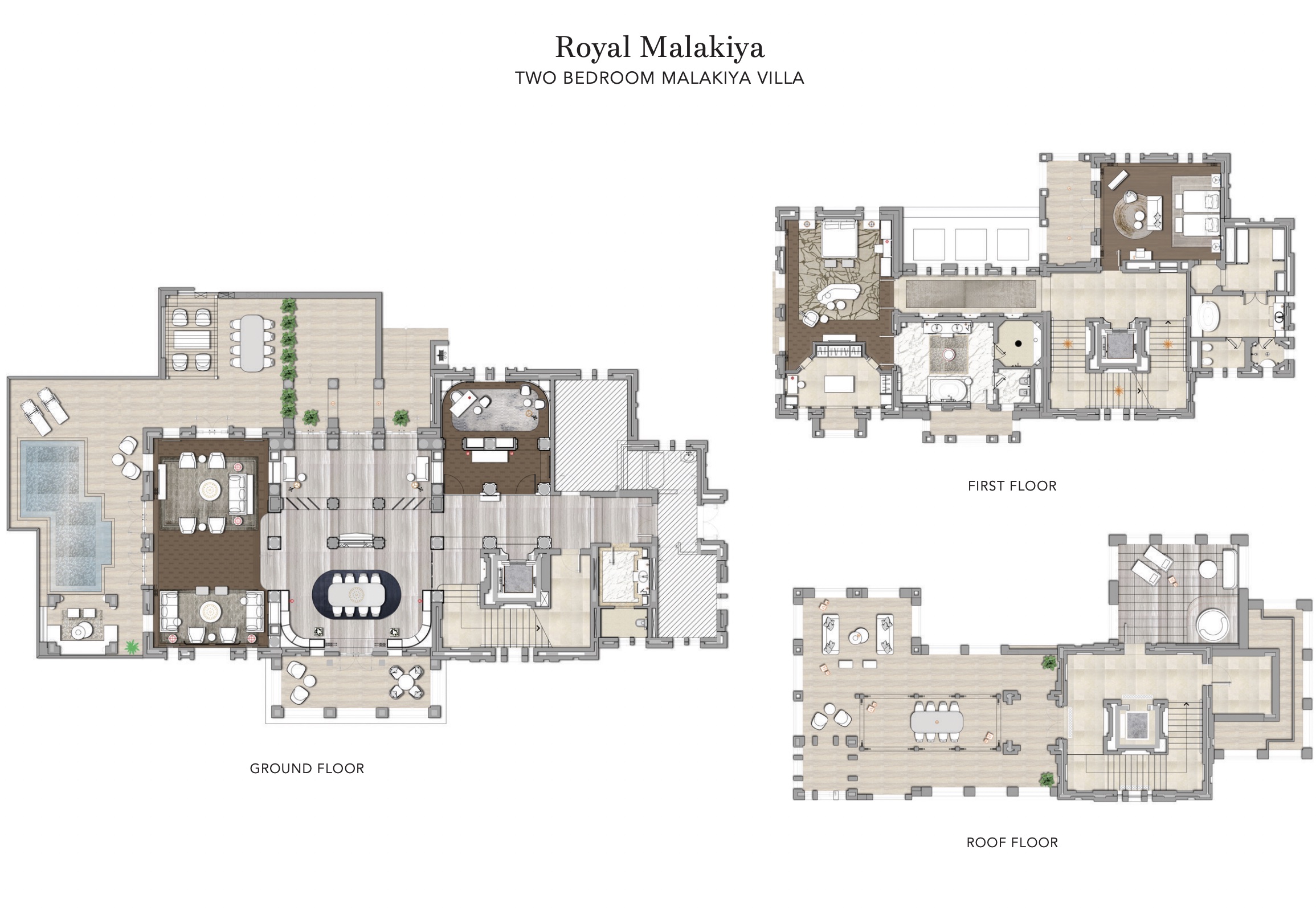На 1-м этаже: спальня с кроватью king-size, гостиная с обеденной зоной (стол на 8 персон), кухня, гардеробная, ванная комната с джакузи и душевой кабиной, гостевой туалет, комната для обслуживающего персонала, терраса с бассейном и обеденной зоной на открытом воздухе.