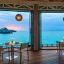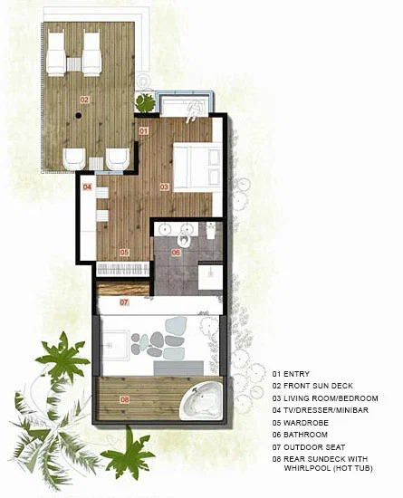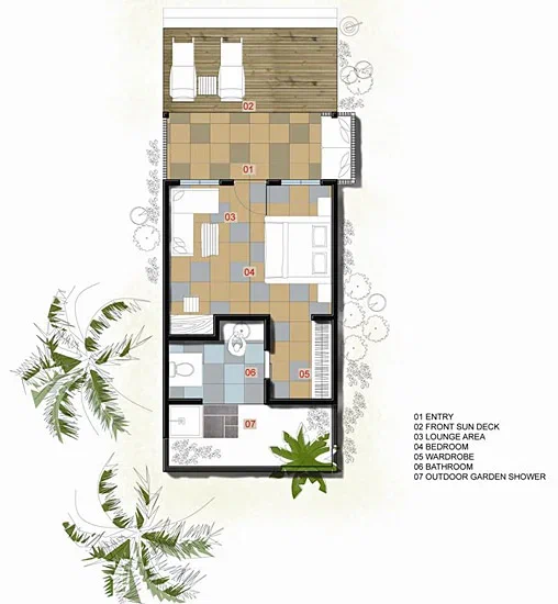 Вилла на берегу. Спальня с кроватью king-size и гостиной зоной, обеденная зона, гостиная, ванная комната с джакузи и душем (частично на открытом воздухе), терраса, сад, патио с бассейном. Гостиная и спальня разделены дверным проёмом.