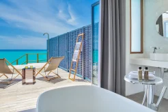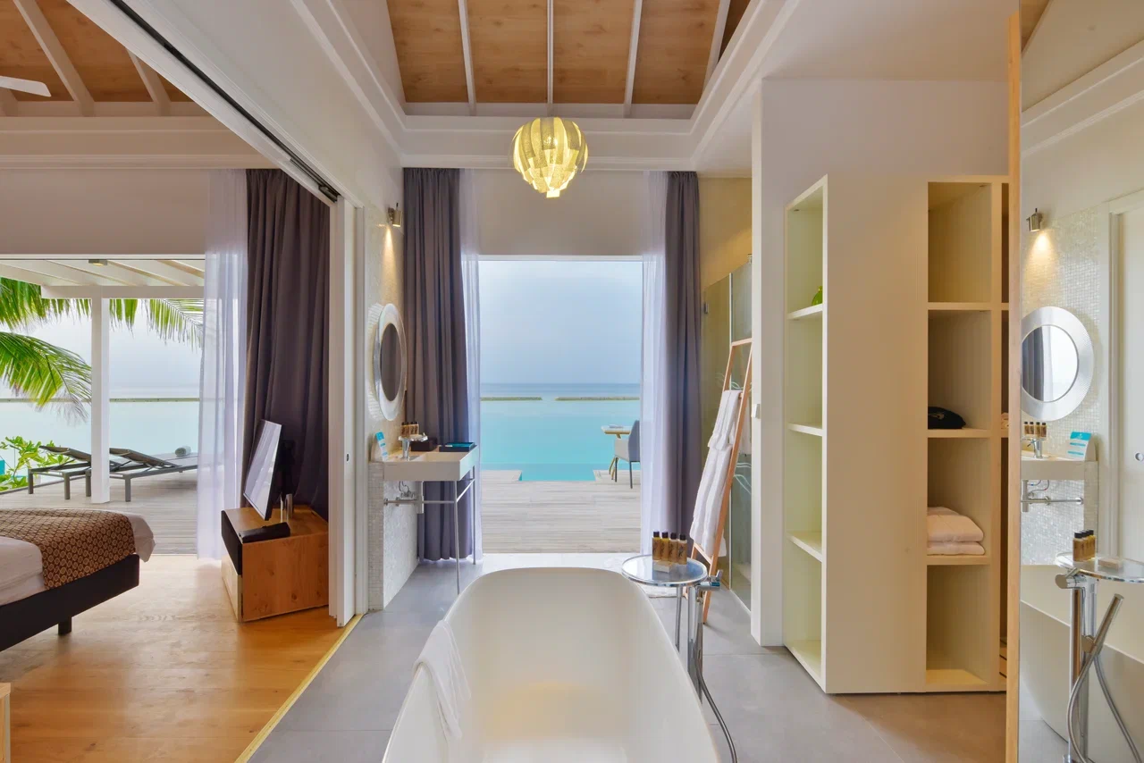 Вилла на воде. Спальня с кроватью king-size, гостиная зона, гардеробная, ванная комната, душ на открытом воздухе, терраса с джакузи на открытом воздухе, прямой спуск к воде.