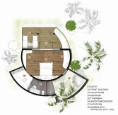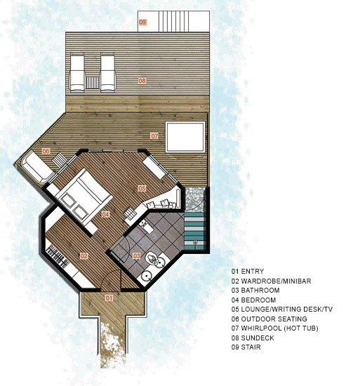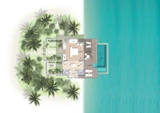 Вилла расположена частично на берегу, частично на воде. Спальня с кроватью king-size, гостиная зона, гардеробная, ванная комната с ванной и душевой кабиной, душ на открытом воздухе, сад, терраса с бассейном.