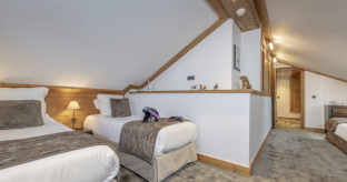 На 2-м уровне: 2 спальни (одна – с кроватью king-size или кроватями twin и гостиной зоной, другая – с 3 кроватями single), ванная комната с ванной, балкон.