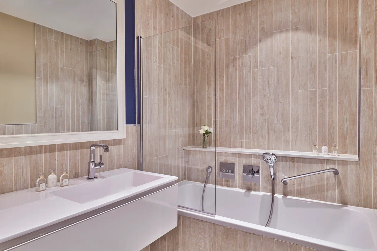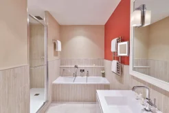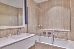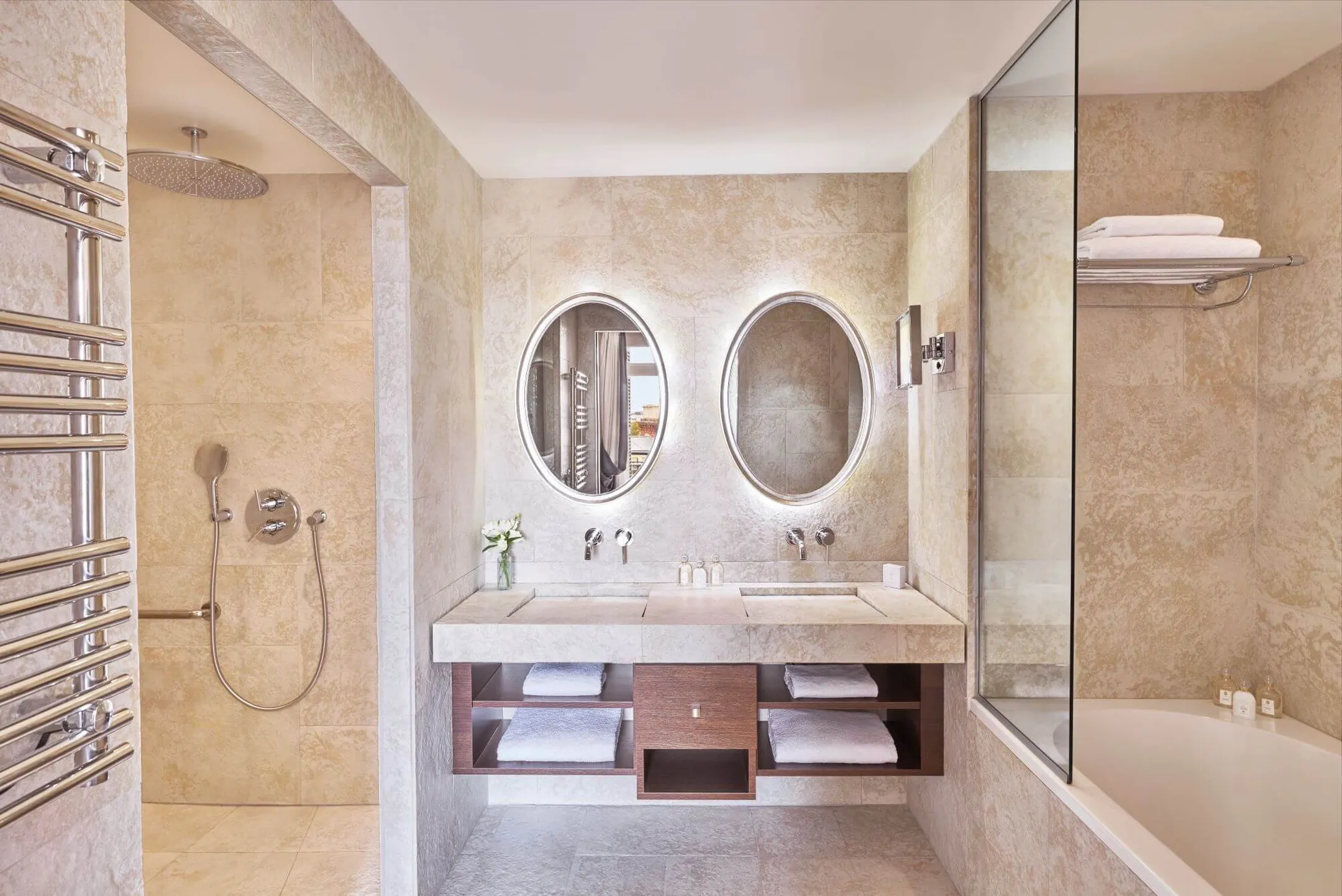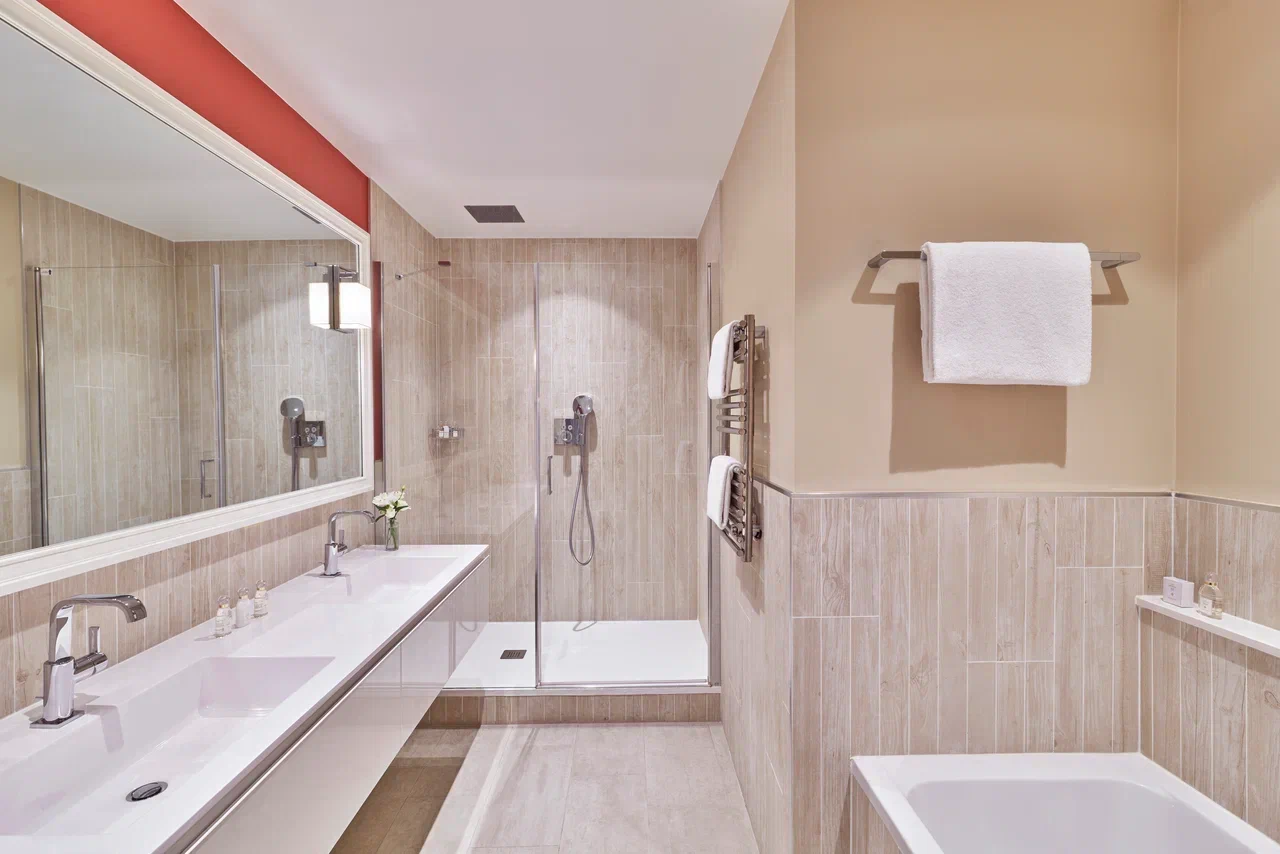 Спальня с кроватью king-size, ванная комната с ванной и душевой кабиной. Вид на город.