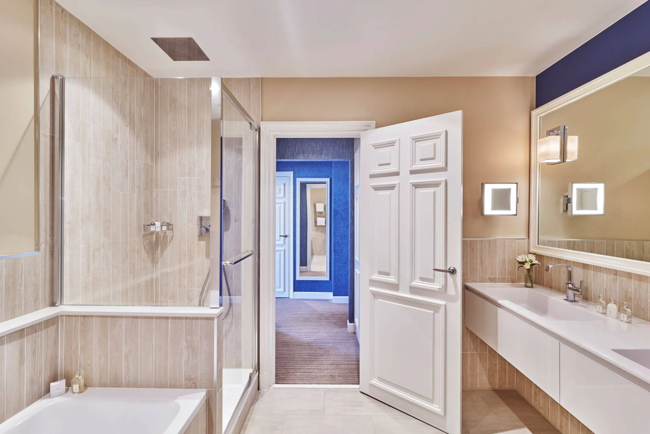 Спальня с кроватью king-size, ванная комната с ванной и душем.