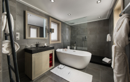 Двухуровневый номер. Спальня с кроватью king-size или кроватями twin, гостиная, гардеробная, 2 ванные комнаты (одна – с ванной и душевой кабиной, другая – с ванной), балкон. Гостиная и спальня расположены на разных уровнях.