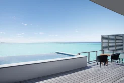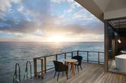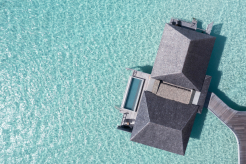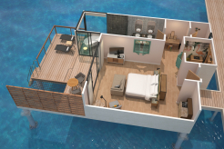 Вилла на воде. 2 спальни с кроватями king-size, гостиная, 2 гардеробные, 2 ванные комнаты (каждая с ванной и душевой кабиной), 2 террасы (одна – с бассейном, другая – с гамаком над водой), прямой спуск к воде. Гостиная и спальни разделены дверями.