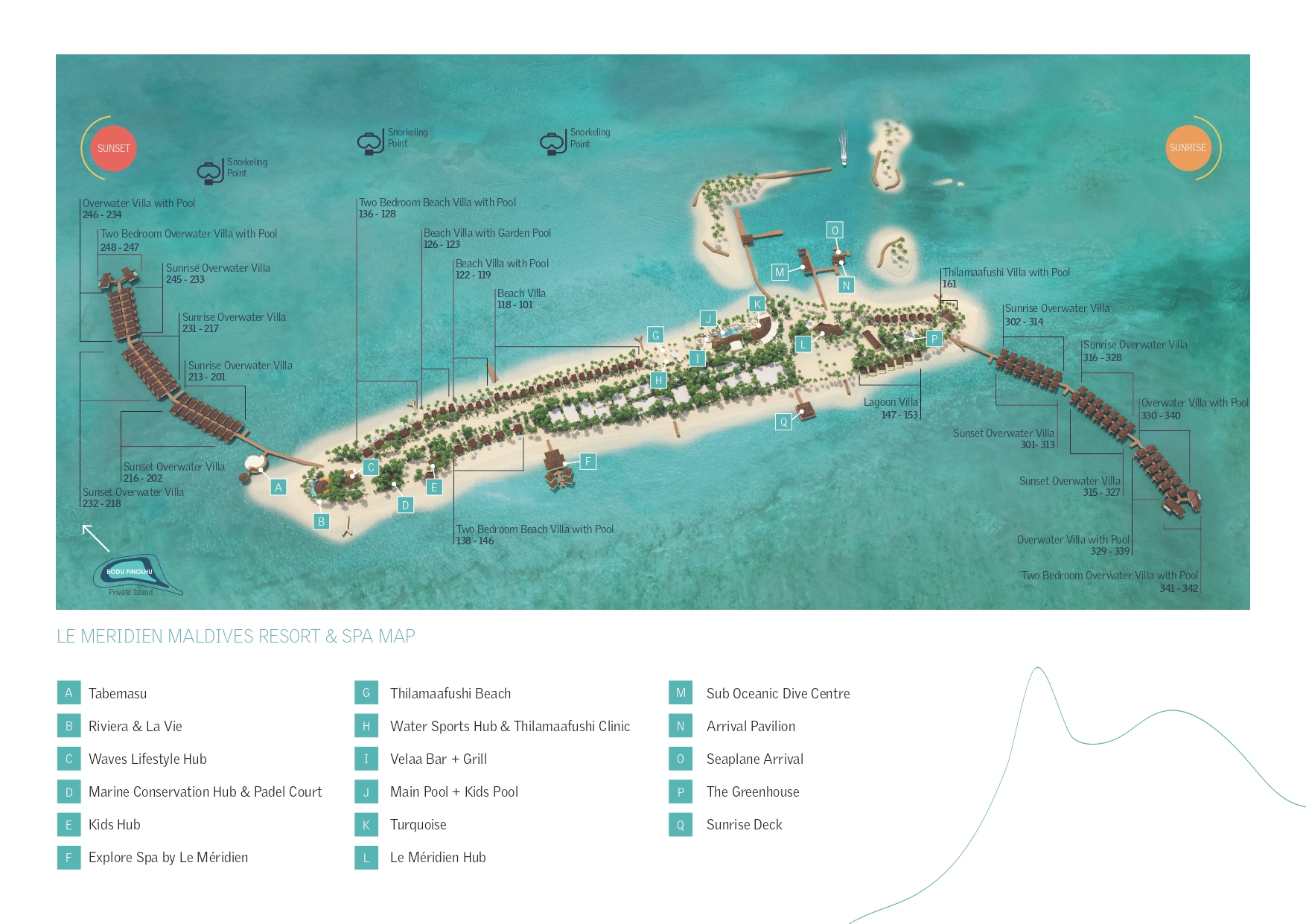 134 виллы, 4 ресторана, 2 кофейни, бар только для взрослых, открытый бассейн, открытый бассейн только для взрослых, открытый детский бассейн, спа-центр, тренажёрный зал, павильон для занятий йогой, центр водных видов спорта, дайвинг-центр, снорклинг, корт для падел-тенниса, прокат велосипедов, детский клуб, кинотеатр под открытым небом, центр морской биологии.