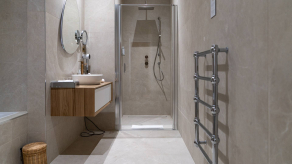Спальня с кроватью king-size, ванная комната с ванной и душевой кабиной.