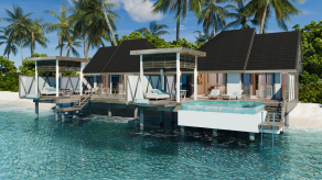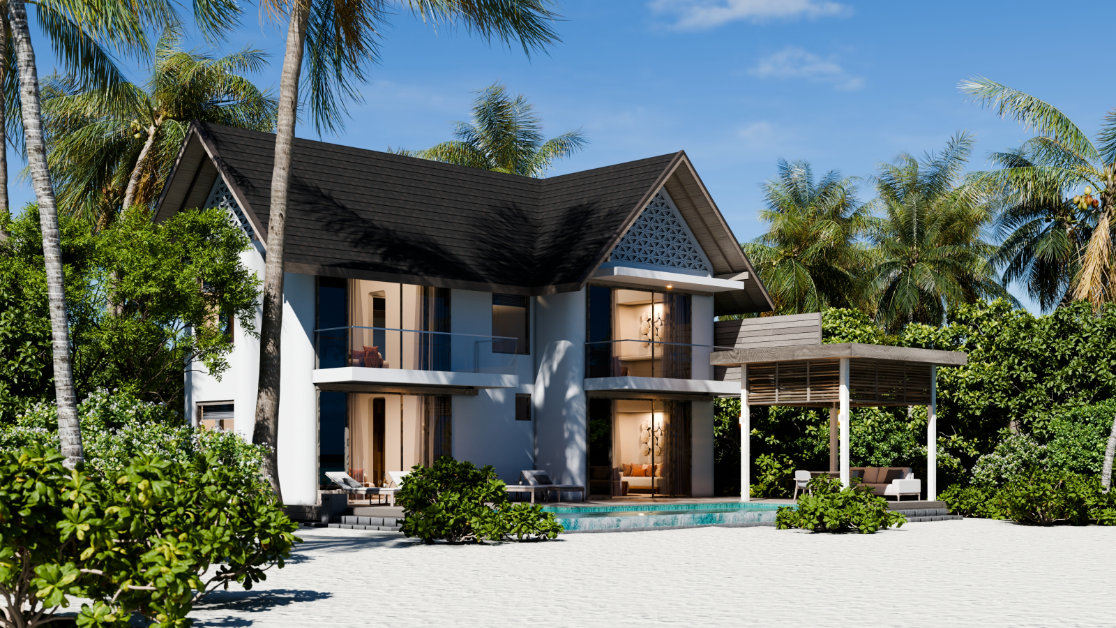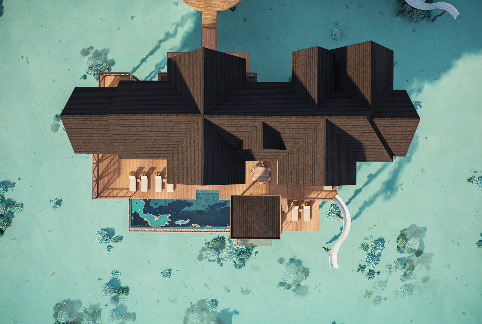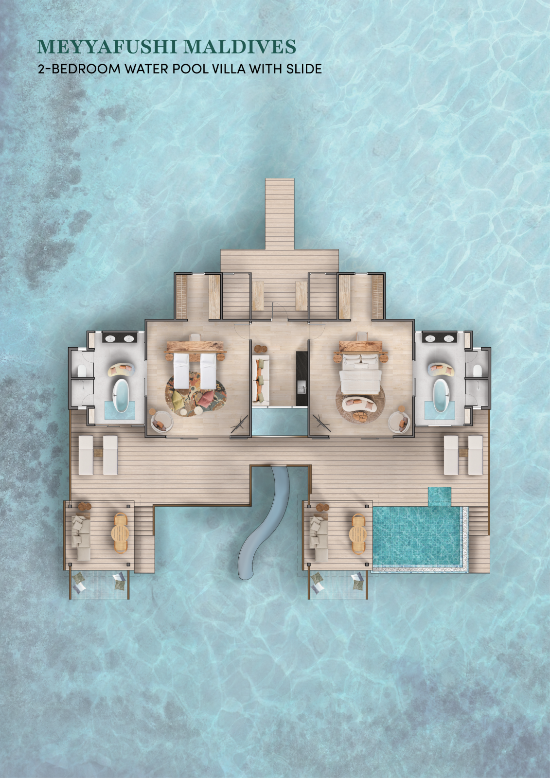 Вилла расположена частично на берегу, частично на воде. 2 спальни (одна – с кроватью king-size, другая – с кроватями twin), 2 ванные комнаты (каждая с ванной и душем), терраса с бассейном, водной горкой и прямым спуском к воде.