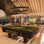 На 1-м этаже: 2 спальни (одна – с кроватью king-size, другая – с кроватями twin), комната с кроватью single, гостиная, столовая с кухней, игровая комната с бильярдом, 4 ванные комнаты (одна – с ванной и душем, три – с душем), терраса с бассейном, водной горкой и прямым спуском к воде. Гостиная и спальни разделены дверями.