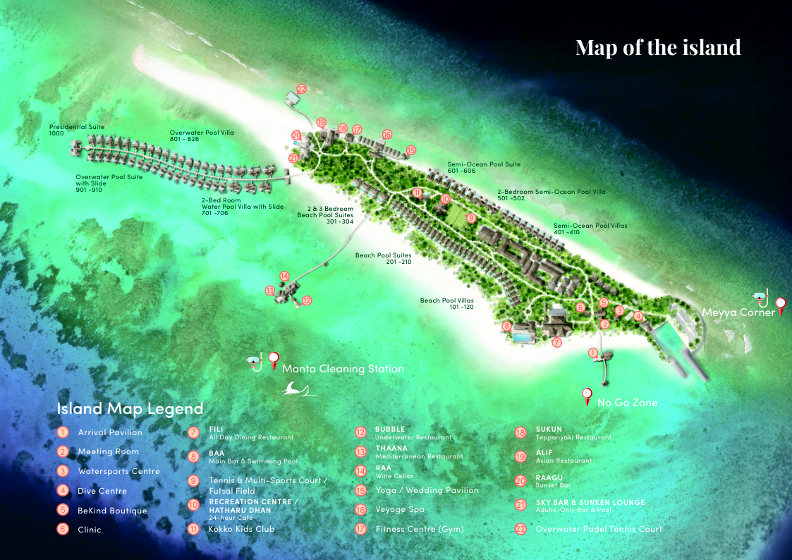 Meyyafushi Maldives работает только по системе premium all inclusive. В числе ресторанов – подводный Bubble, винный погреб Raa Wine Cellar и круглосуточное кафе Hatharu Dhan. Значительная часть инфраструктуры расположена на воде: несколько ресторанов, фитнес-центр, Veyoge Spa и корт для падел-тенниса. В спа-центре проводят процедуры по фирменному спа-меню, основанному на холистических традициях и современных техниках. Детский клуб Kokko Kids Club включает бассейн с горкой, игровую зону на улице, мини-спорткорт, стену для скалолазания и мини-рампу для скейтбординга.