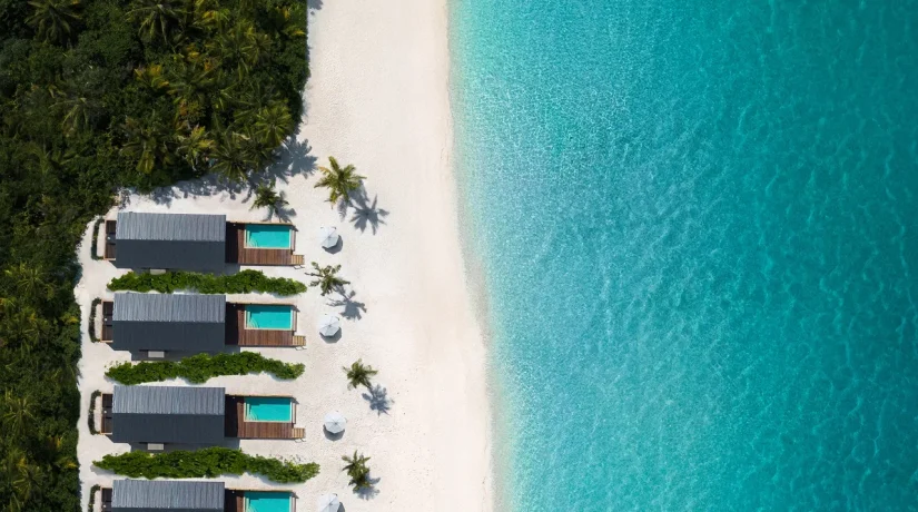 Вилла на берегу. Спальня с кроватью king-size, гостиная зона, ванная комната с душевой кабиной, частный сад с душем на открытом воздухе, терраса с частным бассейном. Прямой доступ к пляжу.
