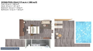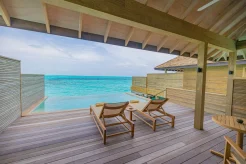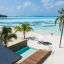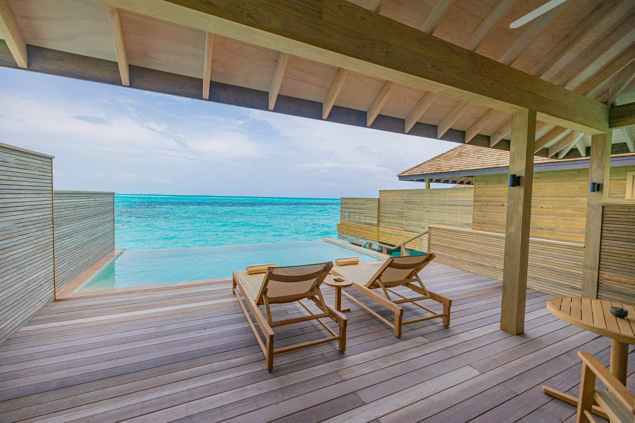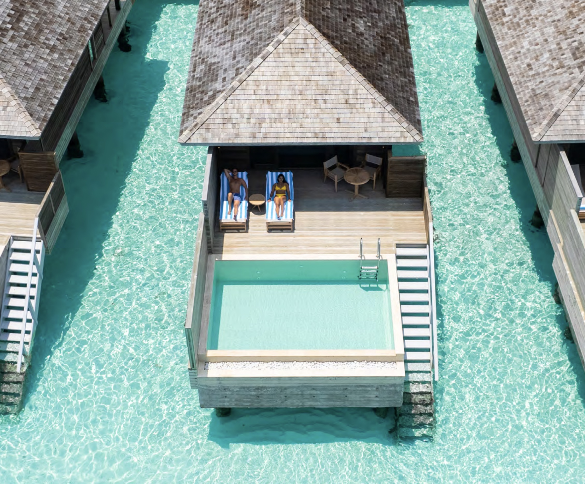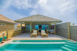 Вилла на воде. Спальня с кроватью king-size, гостиная зона, ванная комната с душевой кабиной, терраса с частным бассейном. Прямой спуск к воде.