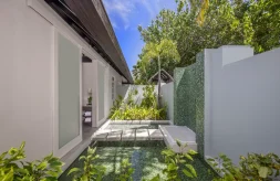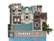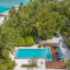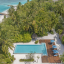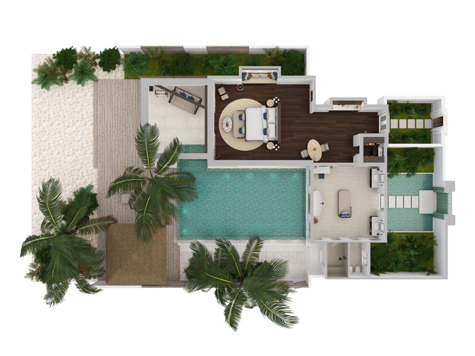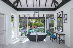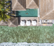 Вилла расположена на берегу и частично на воде. Спальня с кроватью king-size, гостиная зона, гардеробная, ванная комната с ванной и душевой кабиной, душ на открытом воздухе, терраса с бассейном и качелями, беседка с обеденной зоной, частная кабана на берегу на противоположной стороне острова.