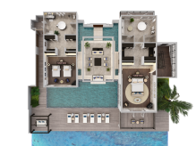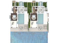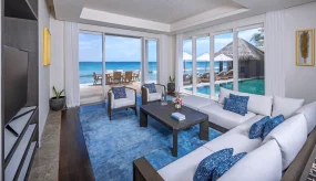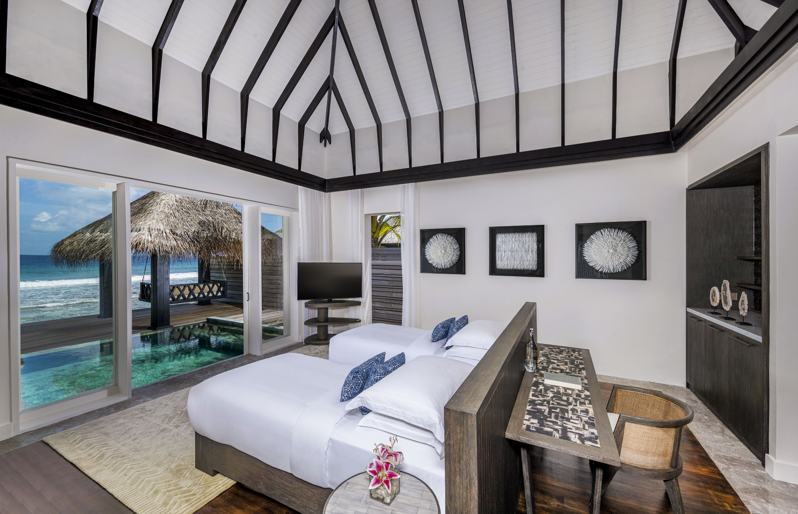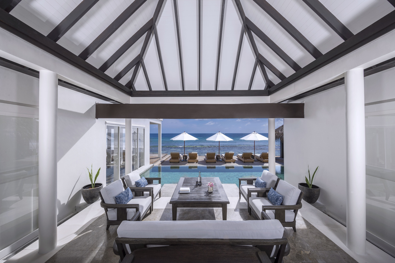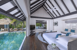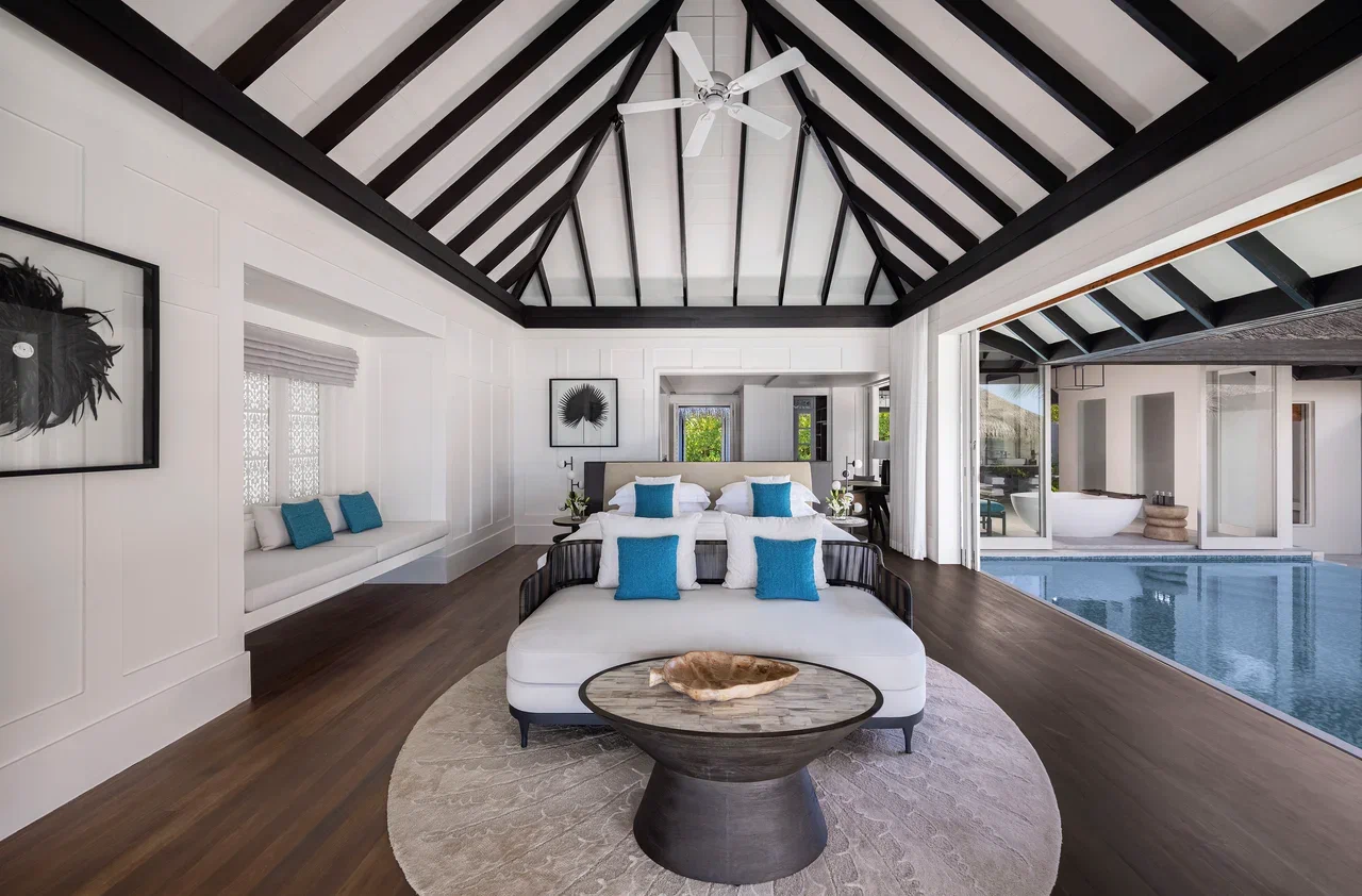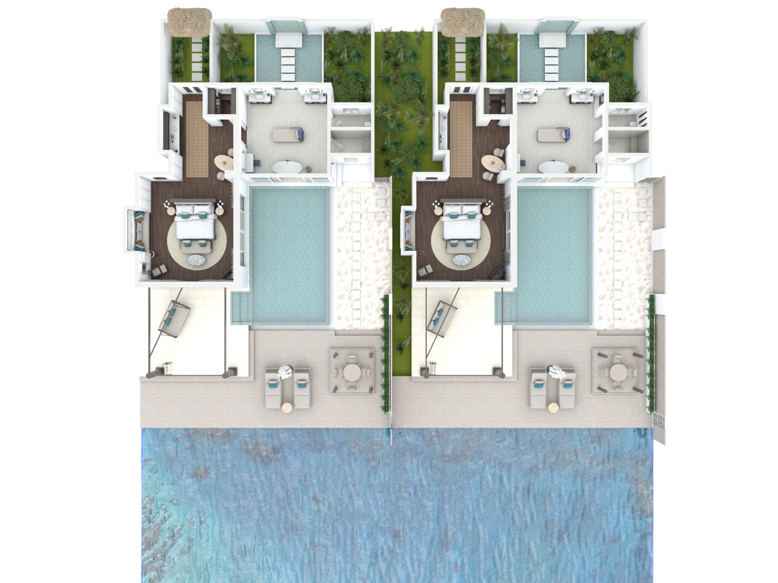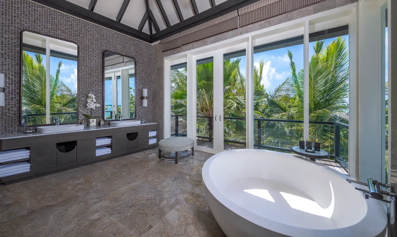 2 соединённые виллы категории Ocean House with Pool and Private Beach Cabana, расположены на берегу и частично на воде. 2 спальни с кроватями king-size и гостиными зонами, 2 гардеробные, 2 ванные комнаты (каждая с ванной и душевой кабиной), 2 душа на открытом воздухе, 2 террасы с бассейнами, качелями и беседками с обеденной зоной, парная, частная кабана на берегу на противоположной стороне острова.