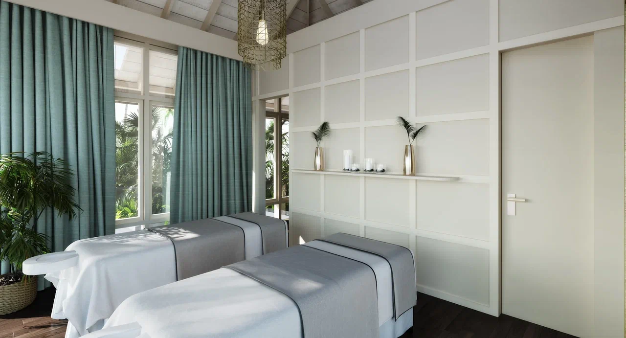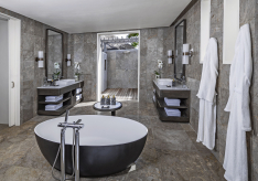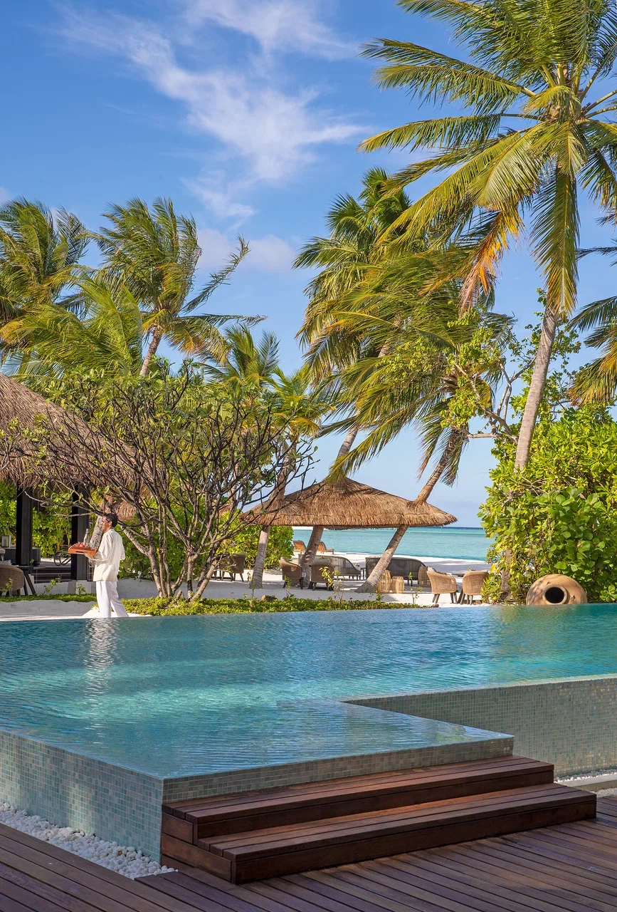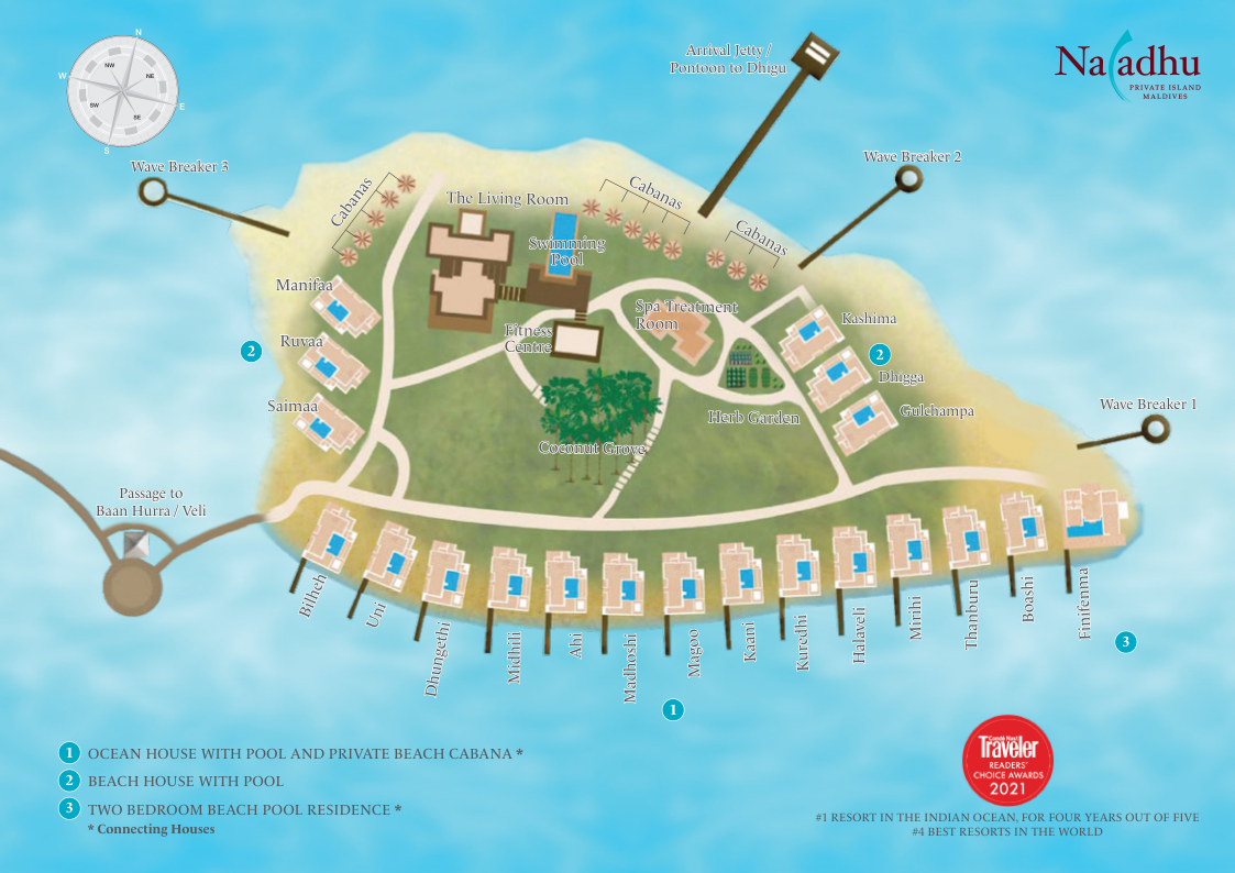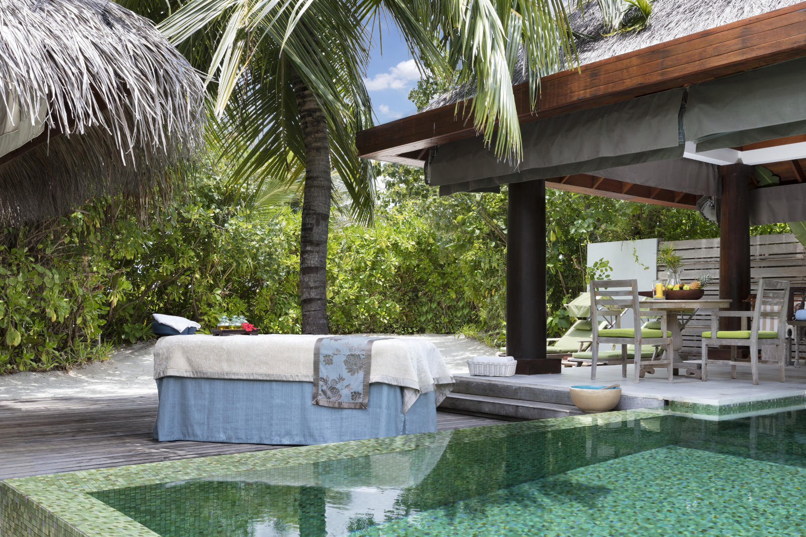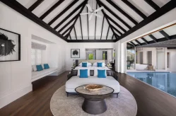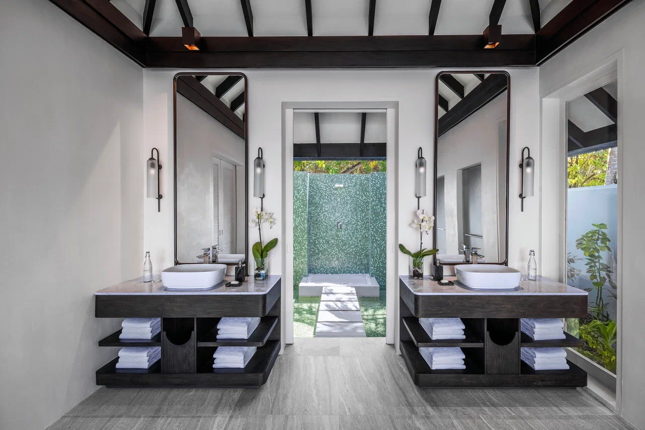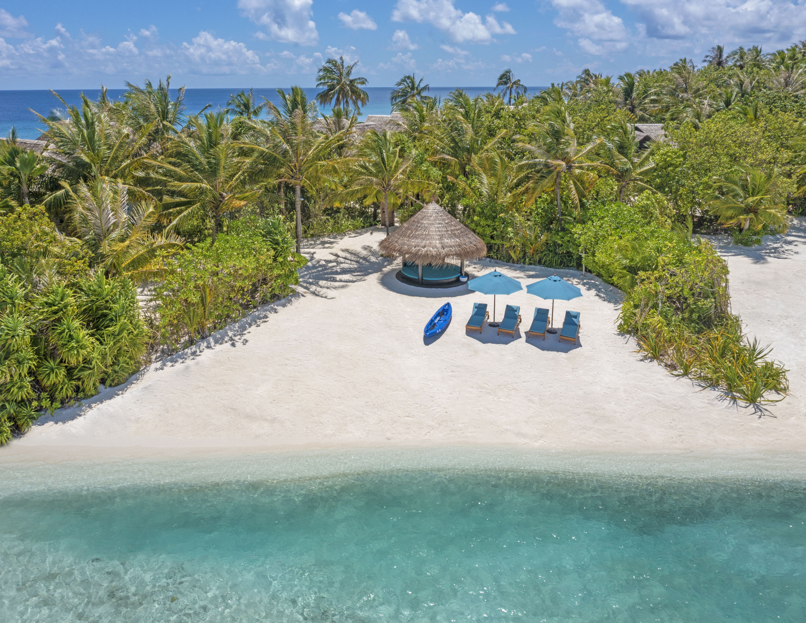 2 соединённые виллы категории Ocean House with Pool and Private Beach Cabana, расположены на берегу и частично на воде. 2 спальни с кроватями king-size и гостиными зонами, 2 гардеробные, 2 ванные комнаты (каждая с ванной и душевой кабиной), 2 душа на открытом воздухе, 2 террасы с бассейнами, качелями и беседками с обеденной зоной, парная, частная кабана на берегу на противоположной стороне острова.