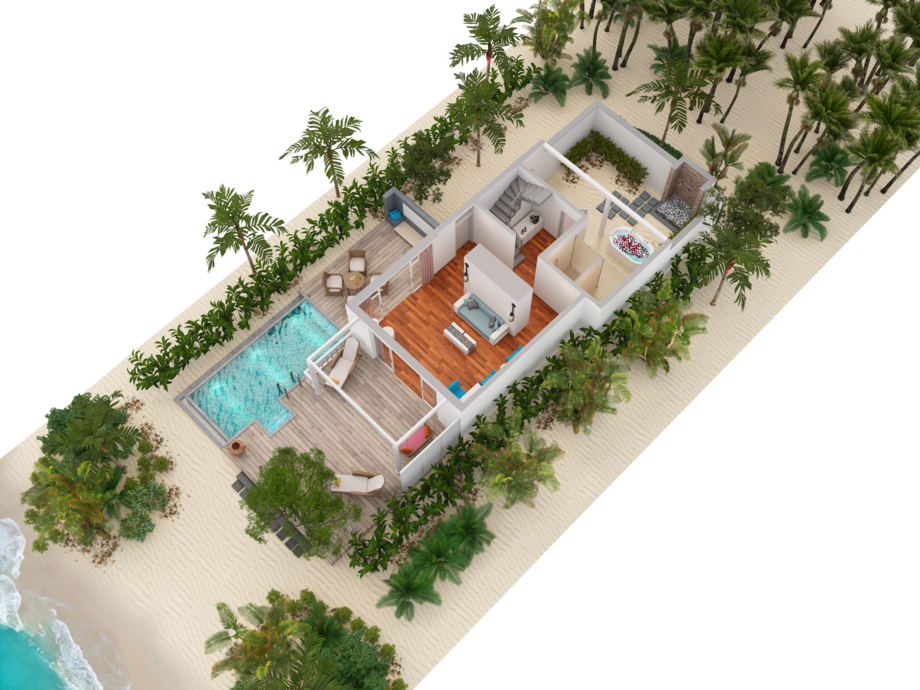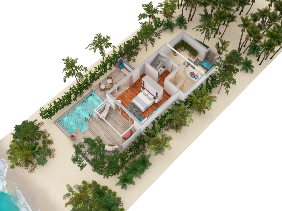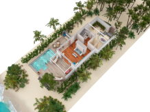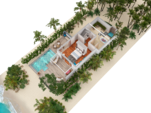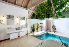 Вилла на берегу. Спальня с кроватью king-size, ванная комната с душевой кабиной и джакузи частично на открытом воздухе, душ на открытом воздухе, терраса, патио с бассейном.